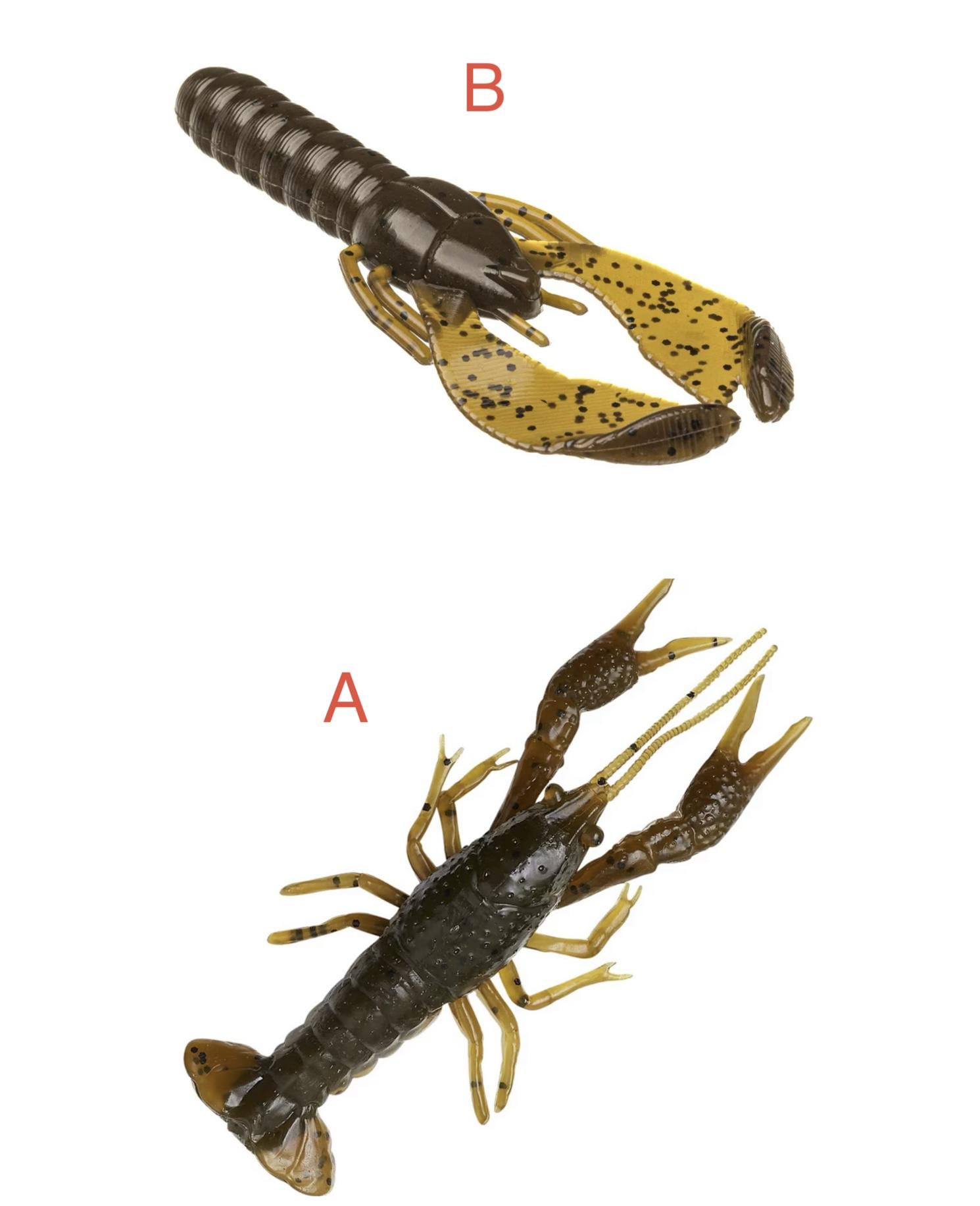 B is close to a bait that would be fished like a worm or grub with a tail. Bass fishers are already very used to those so this is the crayfish version of something people use all the time