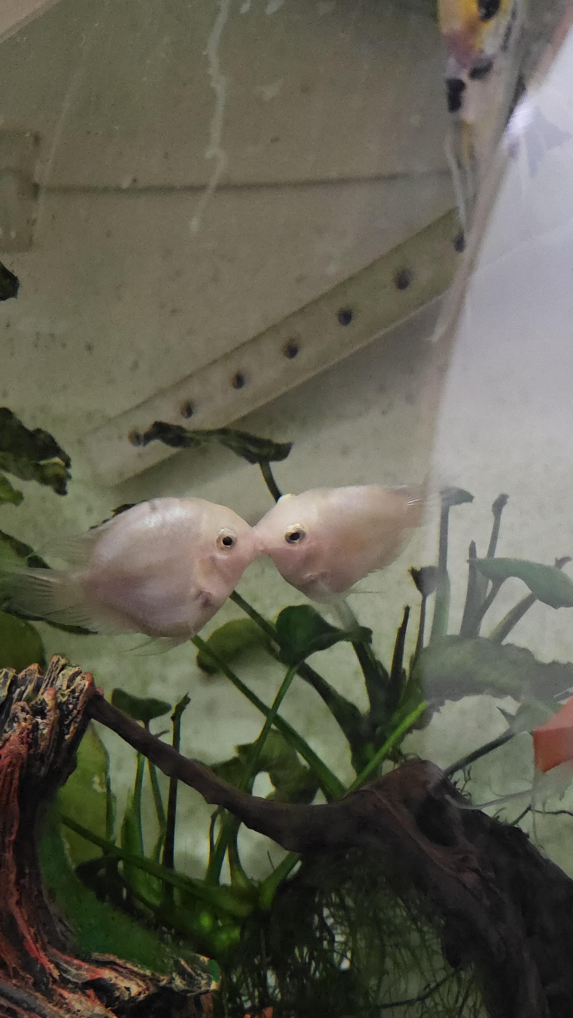 Those are the leucistic variant of the polar blue parrot cichlid.