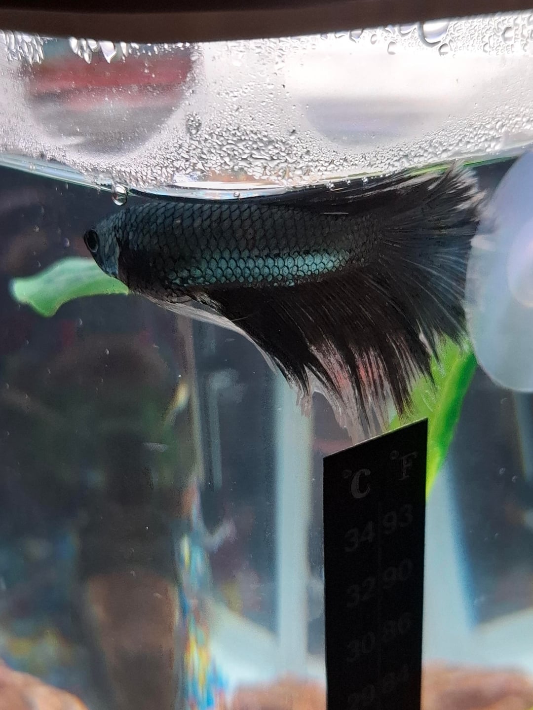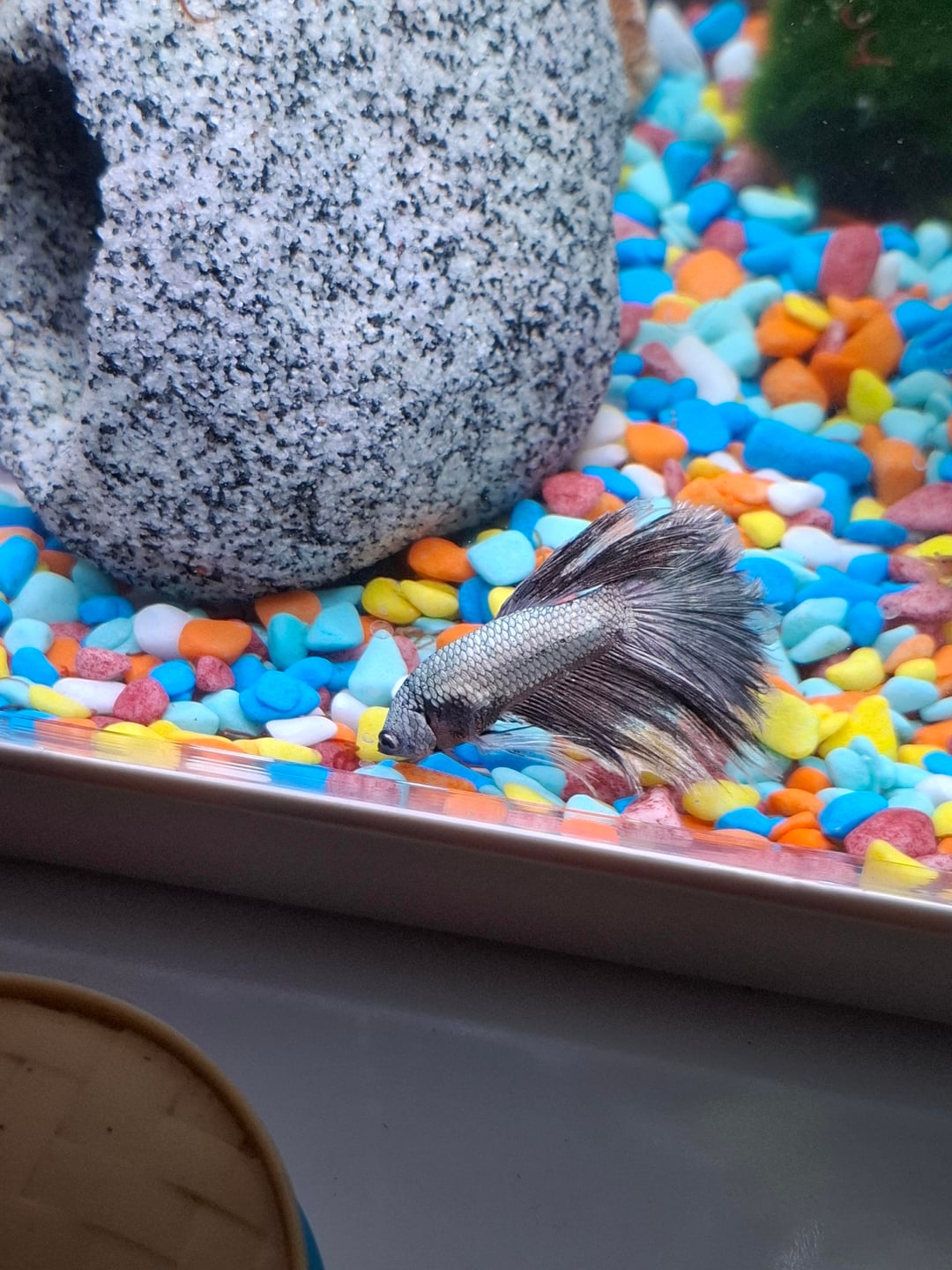 Tank size: 28L / 7.4G Heater and filter?: yes. Tank temperature: 26°C / 78°F. Key water parameters include the amount of ammonia, nitrites, nitrates, and pH: I dont know them but I cycled it with plants for 2 weeks, the test strips I ordered with the tank still haven’t arrived. How long have you had the tank? How long have you had your fish?: 3 weeks, ~3 months. How often are water changes? How much do you take out per change? What is your process?: havent done a water change yet, plan to do a quarter water chnage at the month mark. Any tankmates? If so, please list with how many of each: Neocaridina davidi ~8 hard to keep track. What do you feed and how much: alternating diet of high protein pellets, colour boosting flakes and live bloodworm but switching to daphnia in a breeder tank soon. Decorations and plants in the tank: cave, rock, betta bed leaf, moss ball, schismatoglottis prietoi, alternanthera cardinalis variegata, hygrophila corymbosa. Picture of the full tank attached