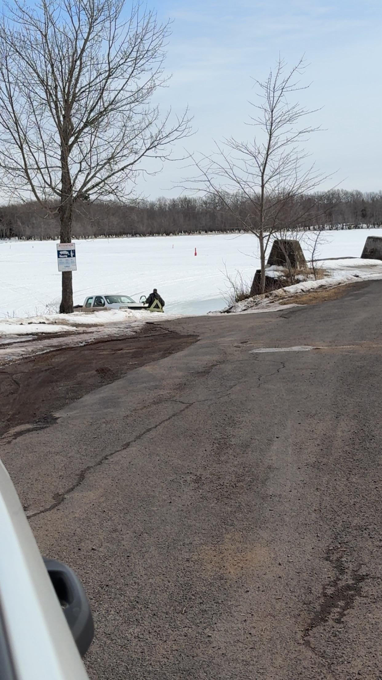 So I was about to make a left on to this road to park and go ice fishing, the guy that’s stuck down there decided to blow a stop sign and almost drifted into the front of my truck so I honked and threw my hands up. He slams his truck in reverse and flies down this road after me and didn’t shift it into park when he was getting out to fight me. So naturally his truck backs down a boat ramp and he’s stuck. All of the sudden he’s trying to apologize and I told him karma is a bitch and I can’t be bothered to get my chains out to help him and drove off.