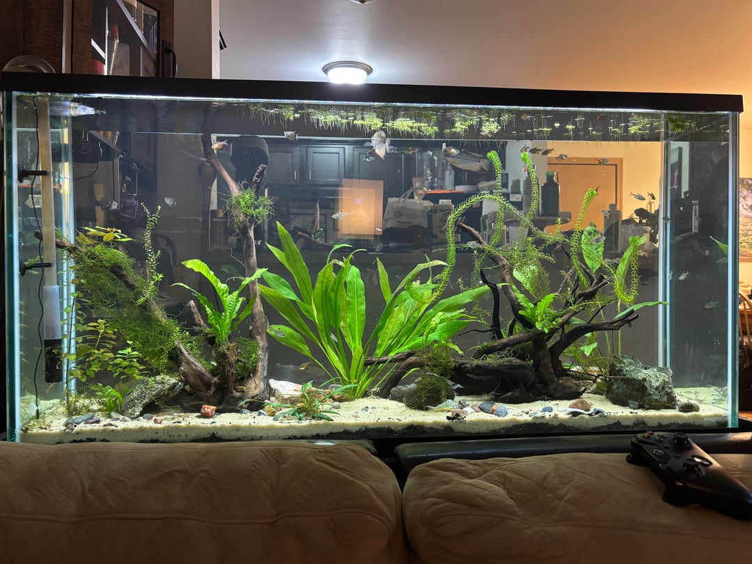 Currently stocked with about 25 tetra, Red eye tetra von rio and pristilla tetra, a couple of paleatus corys, 25 amano shrimp and 2 pearl gourami. Just re scapped the tank as my old one started to crack so I replaced it and re did it. Includes various anubias, java fern, luchens, amazon swords and ludwigia ovalis.