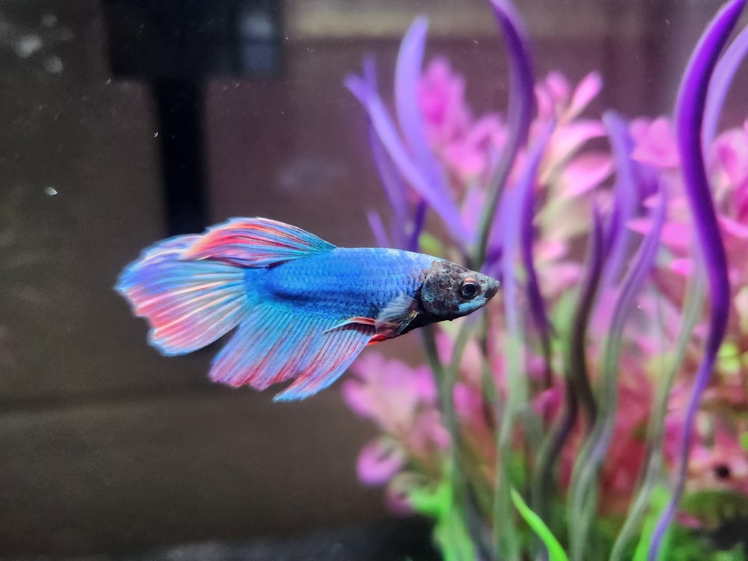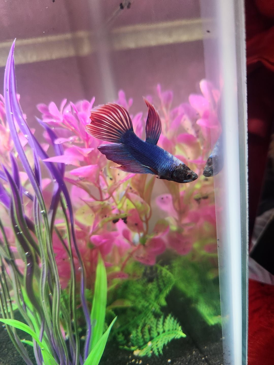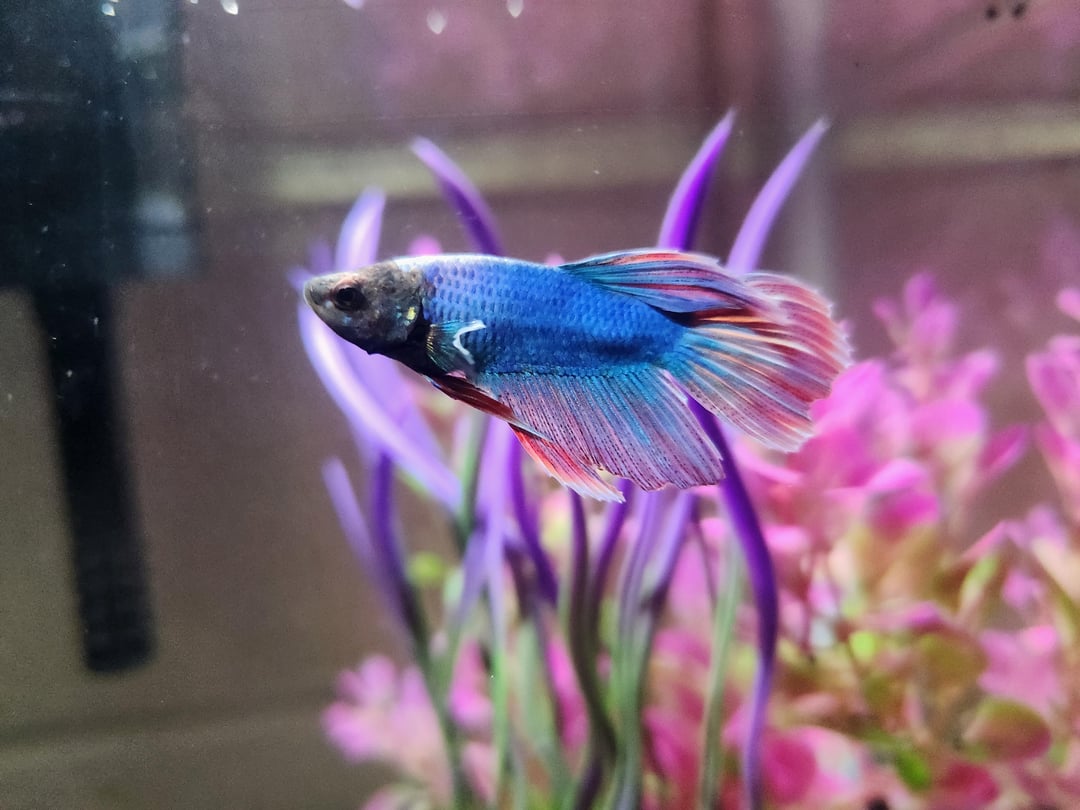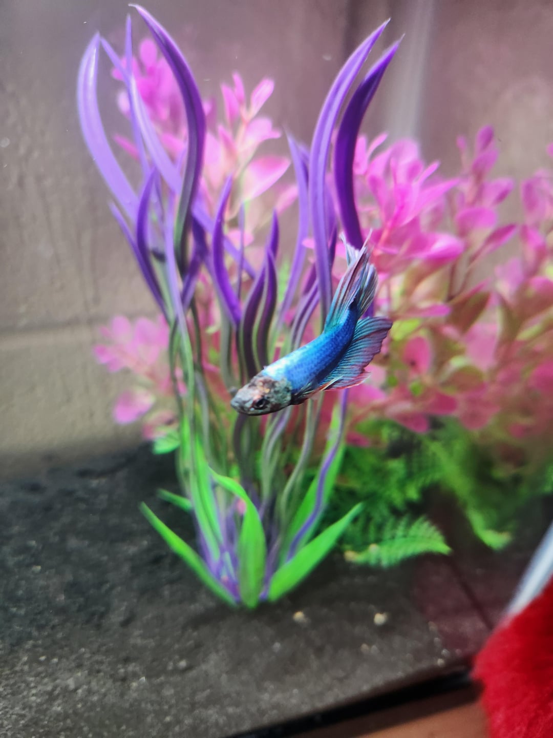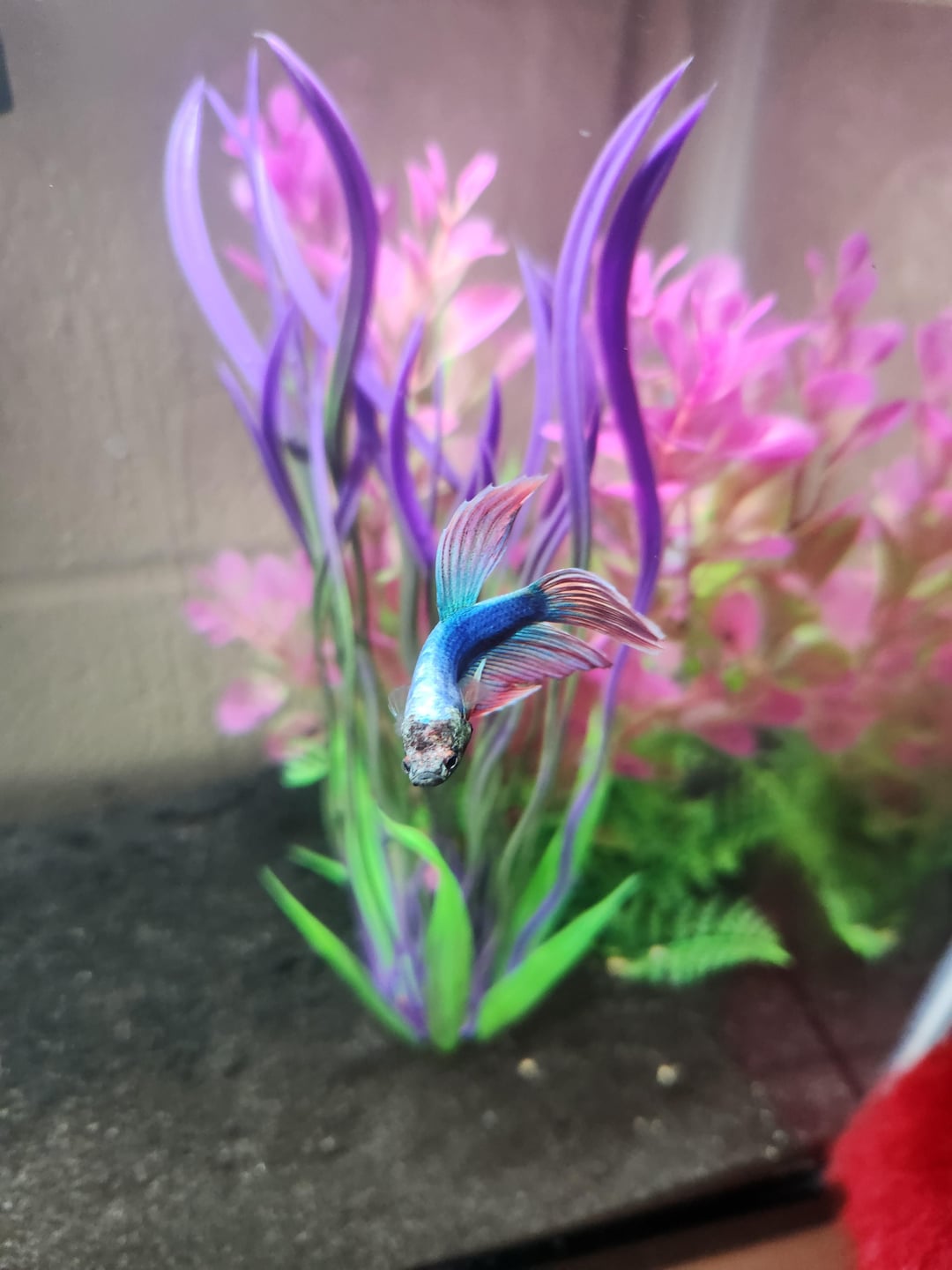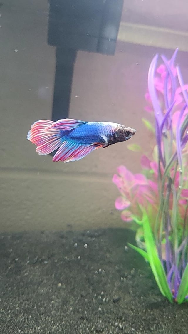 Looks like he got a ripped fin on the left side on a second pic. I’d recommend to get rid of the plastic plants and get real one but boy he’s handsome