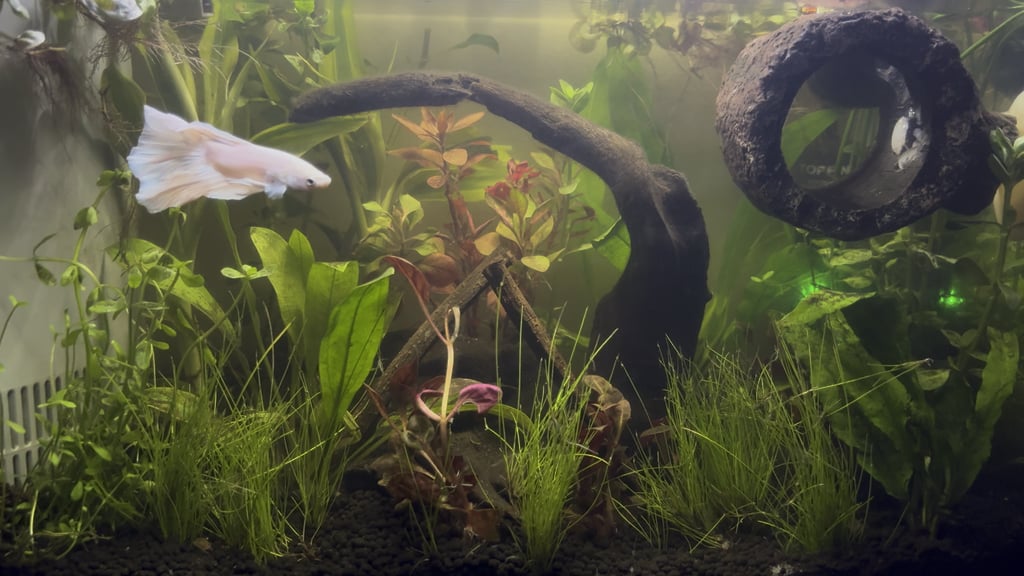 this is my betta! he’s in a 5gal with live plants, tannins, betta log, driftwood, and floaters! i’m still trying to figure out a name for him. is there any upgrades i could do for his tank? https://v.redd.it/lzjftnj22rng1 Posted by Electrical_Acadia948