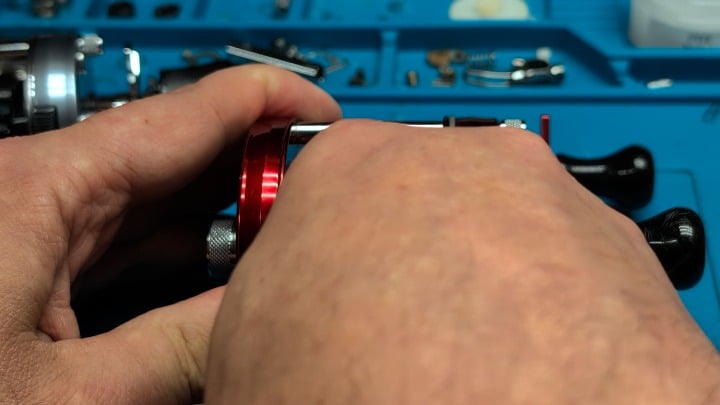 This is purely a bushing reel, no bearings anywhere. All friction points polished to a mirror finish and a thin film lube applied. The customer wanted spool bearings, but I couldn't find 3.25x10x4 bearings from a reputable manufacturer. I took a Dremel and some blue jeweler's rouge to it.