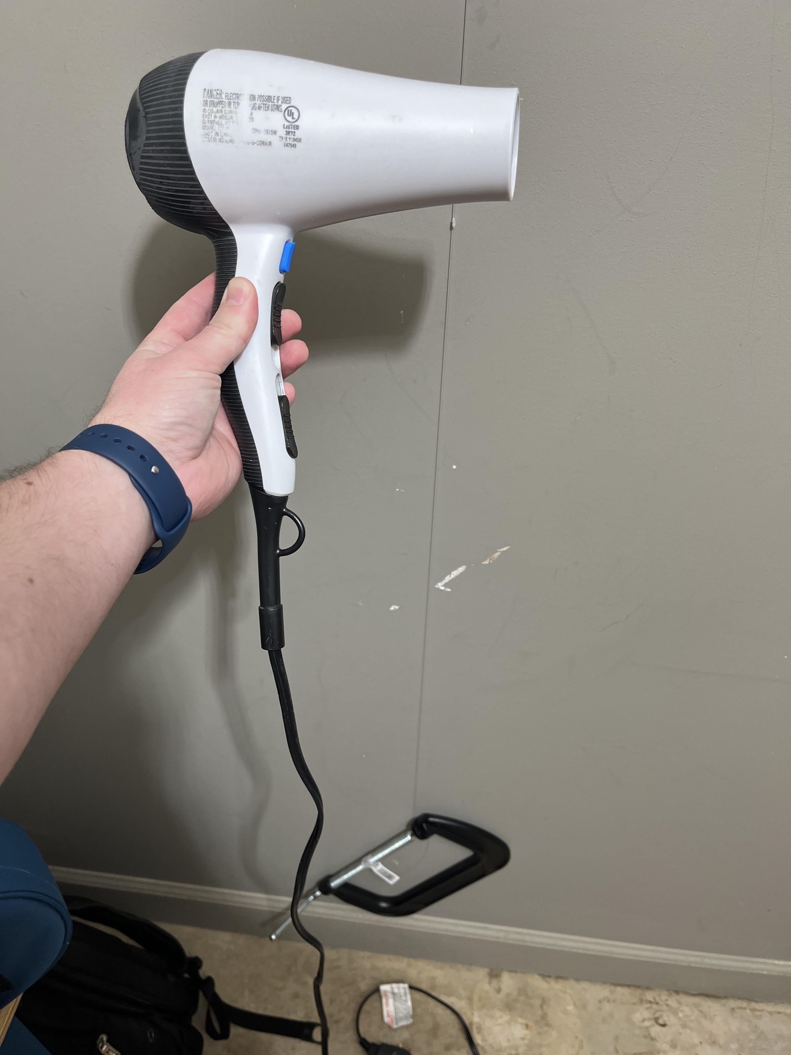 For the past few days, I’ve been experimenting with different methods of straightening these leaders. I tied a 9’ leader with Rio Hard 25lb and 16lb. I knew it had to be done under tension, so I hung the leader from a nail on the wall and attached a 10lb C-clamp to stretch it out. After 24 hours hanging in my shop, the leader still had a bad curl to it. That’s when I began to experiment with heat.