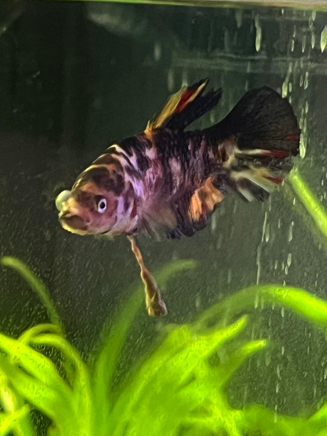 Woke up this morning after doing a big water change yesterday on my beta tank to find him like this. one of us eyes is very swollen and he has something hanging from him. any knowledge or care would be greatly appreciated.