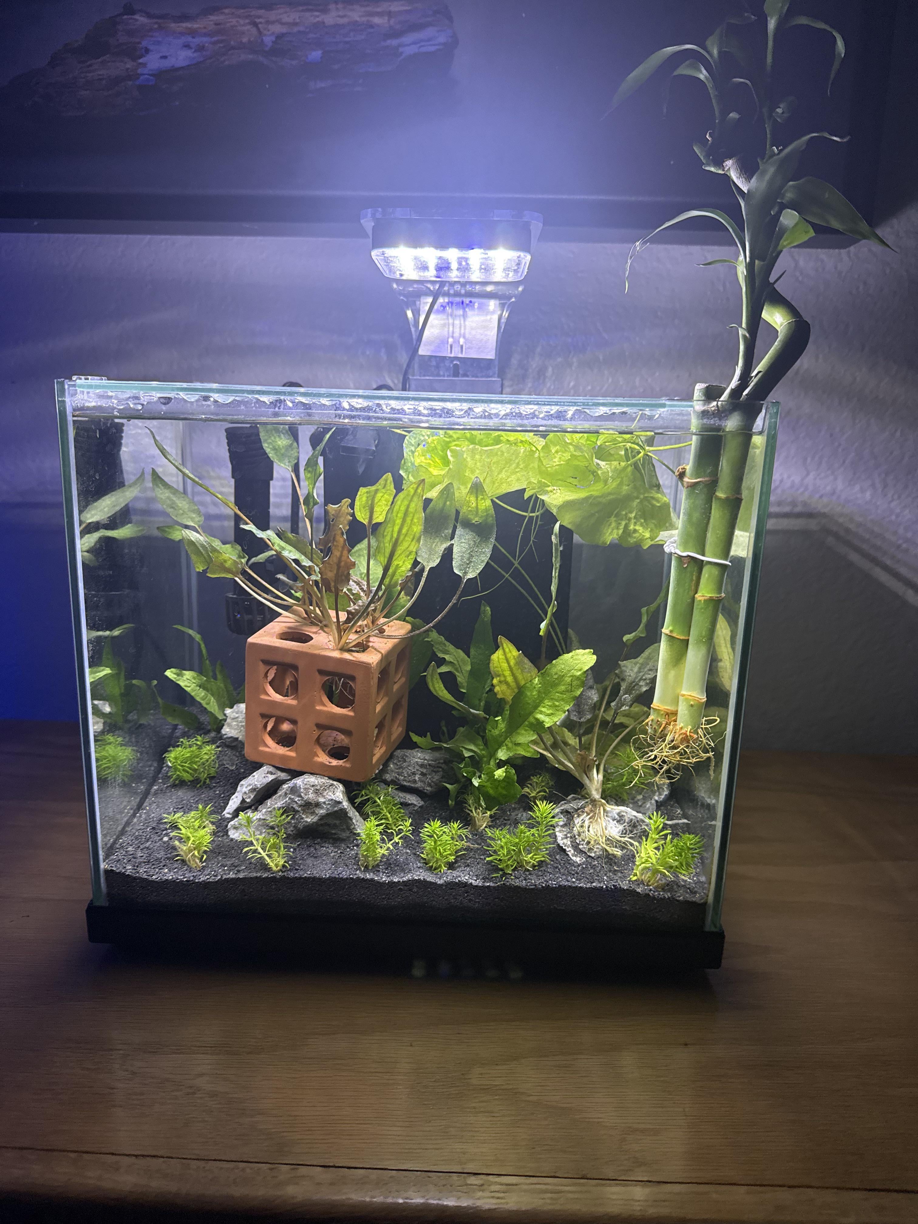 I forgot the size of this tank, but I put in some black substrate to really make everything else pop. For now I only have 2 nerite snails in here but they’re loving it. Posted by GreasyCranium