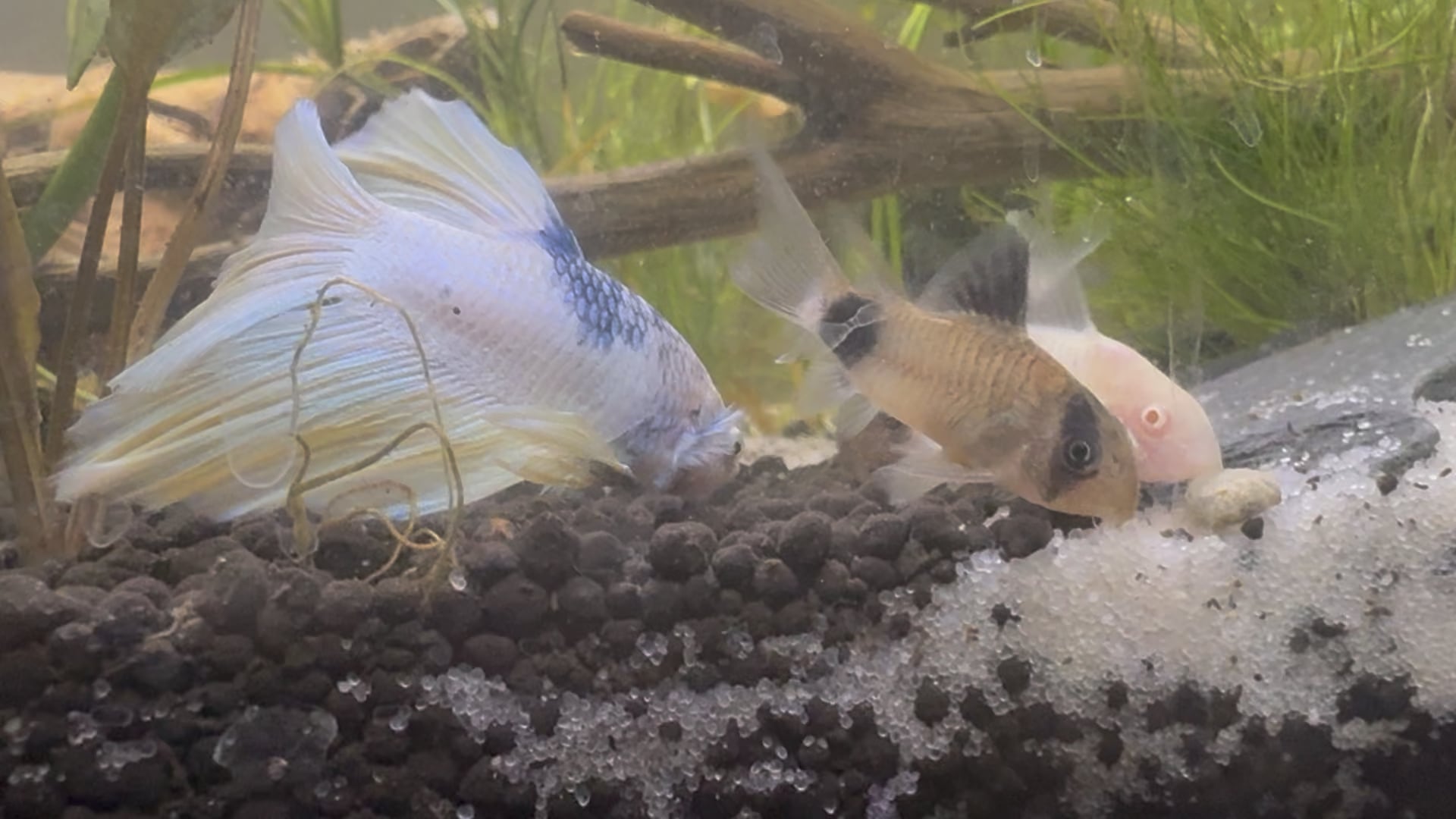 Ahahahhaa they’re soo greedy. This is why I’ve had to start feeding my Corys powdered fry food. It’s soo funny now watching my betta lose his head as he knows there’s food on the floor can see the Corys going mad for it but can’t see it to steal it 🤣 Their greed is sickening 😭