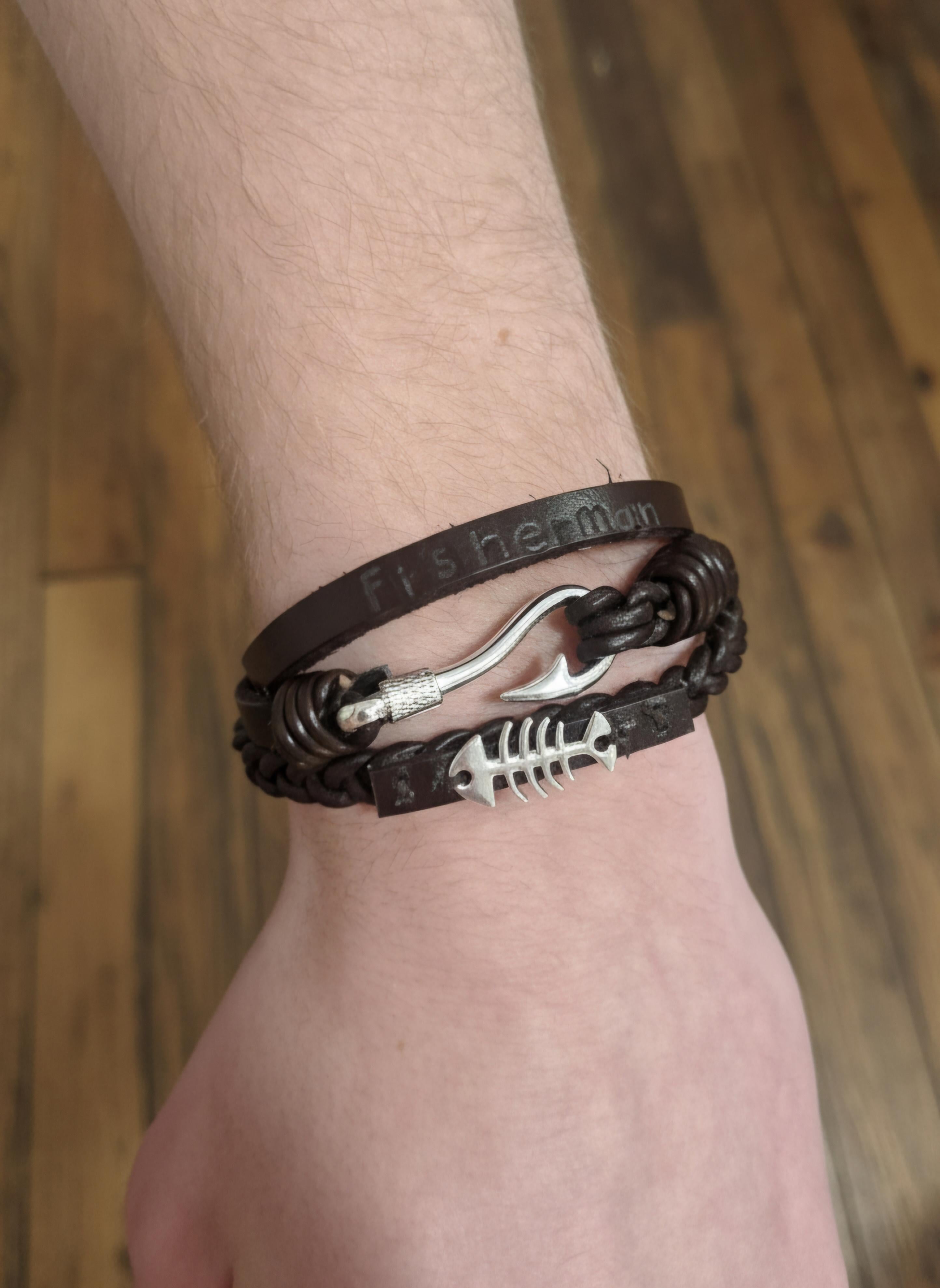This leather bracelet has multiple bands, including a small hook detail, a tiny fish bone charm, and a custom text band that can be personalized.