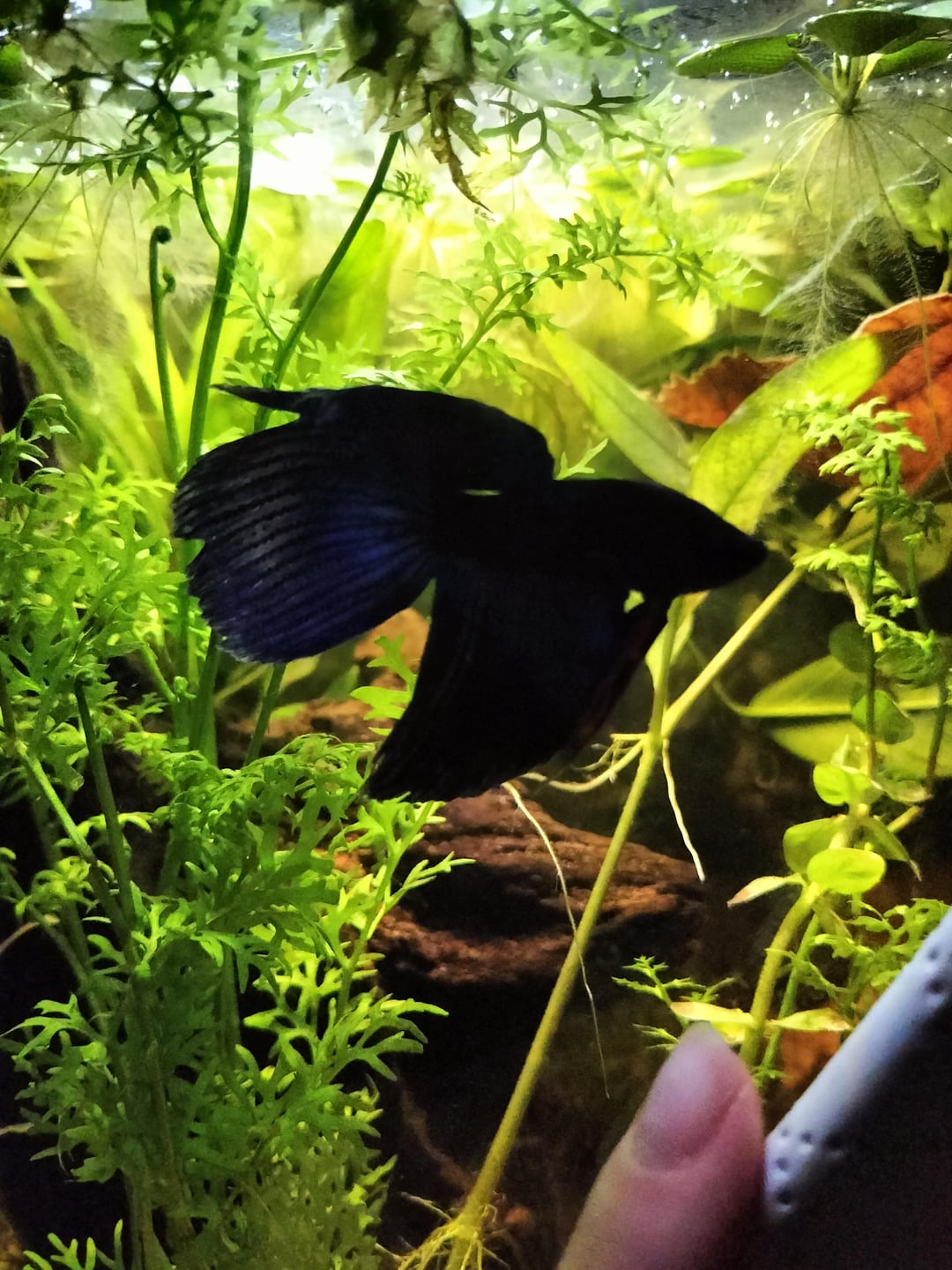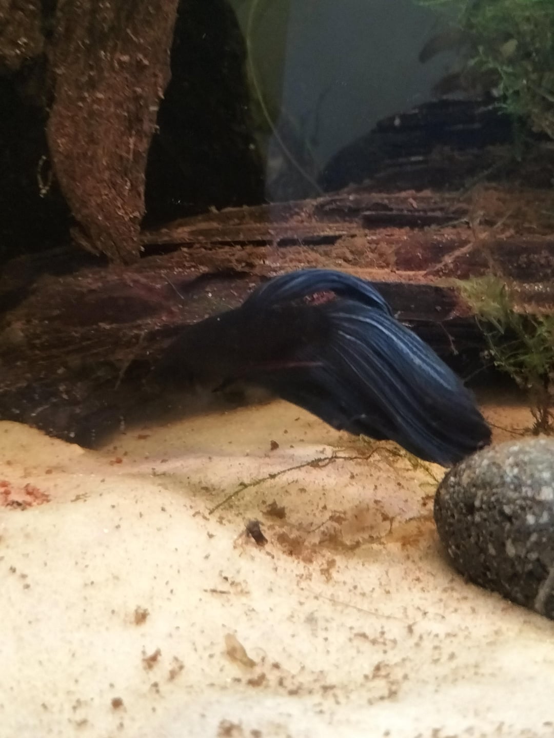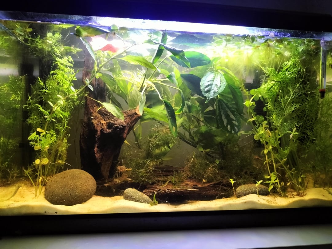 the tank has soft sand substrate,gravel towards the back, driftwood, some smooth round rocks and lots of live plants like frogbit,aluminum, duckweed, bacopa,baby tears, lace fern, some weird frilly plants, Java moss and an anubias