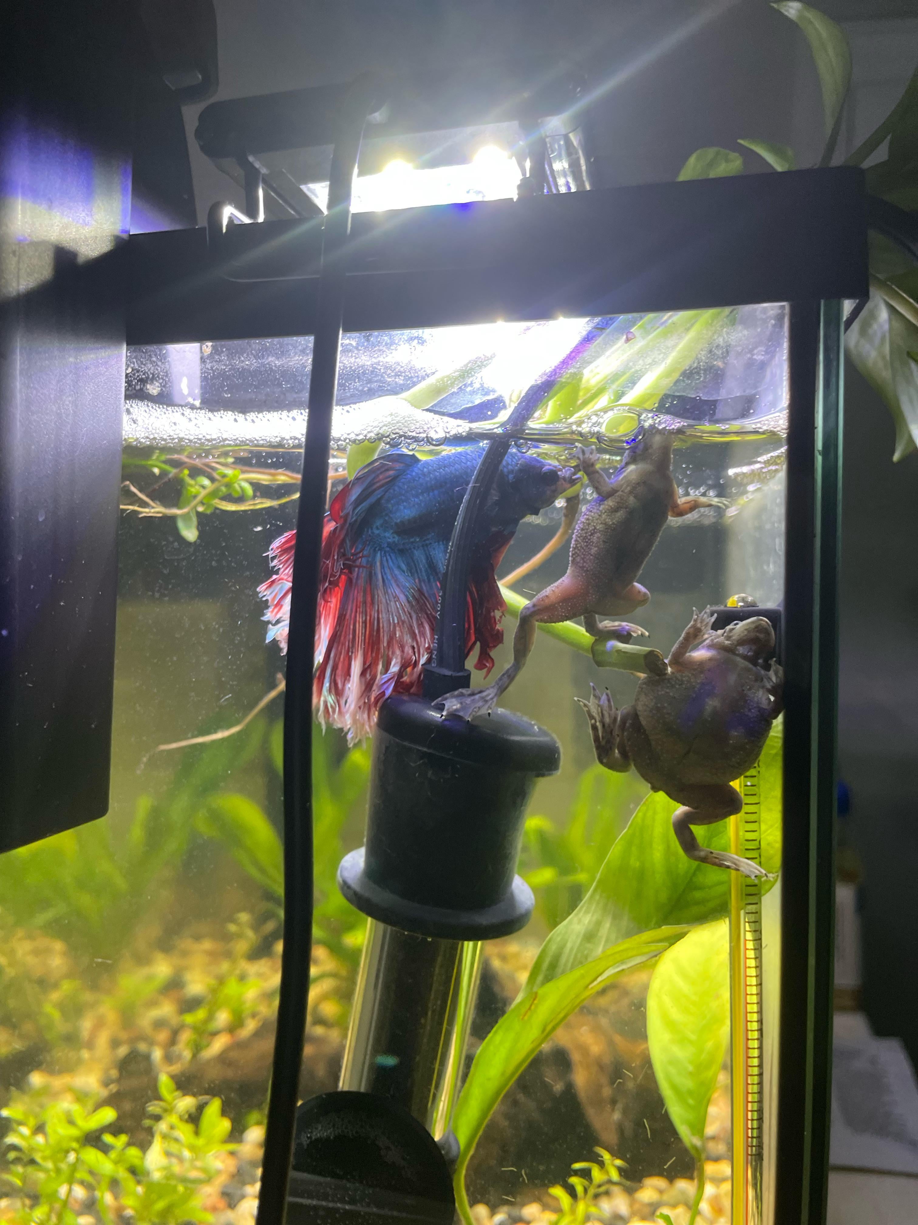 Omg at first I didn’t even notice the big fat frog I only looked at the smaller one by the betta lol I thought the other one was a plant leaf lmaoooo he’s so fat!