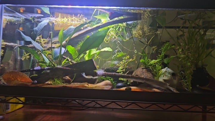 Here's my girl PB admiring my tank. Her pecking is light enough it doesnt seem to bother the fish. Shes a gentle lady. Also its early in the morning so dont mind how the other light hasnt turned on yet, it will in a few minutes.