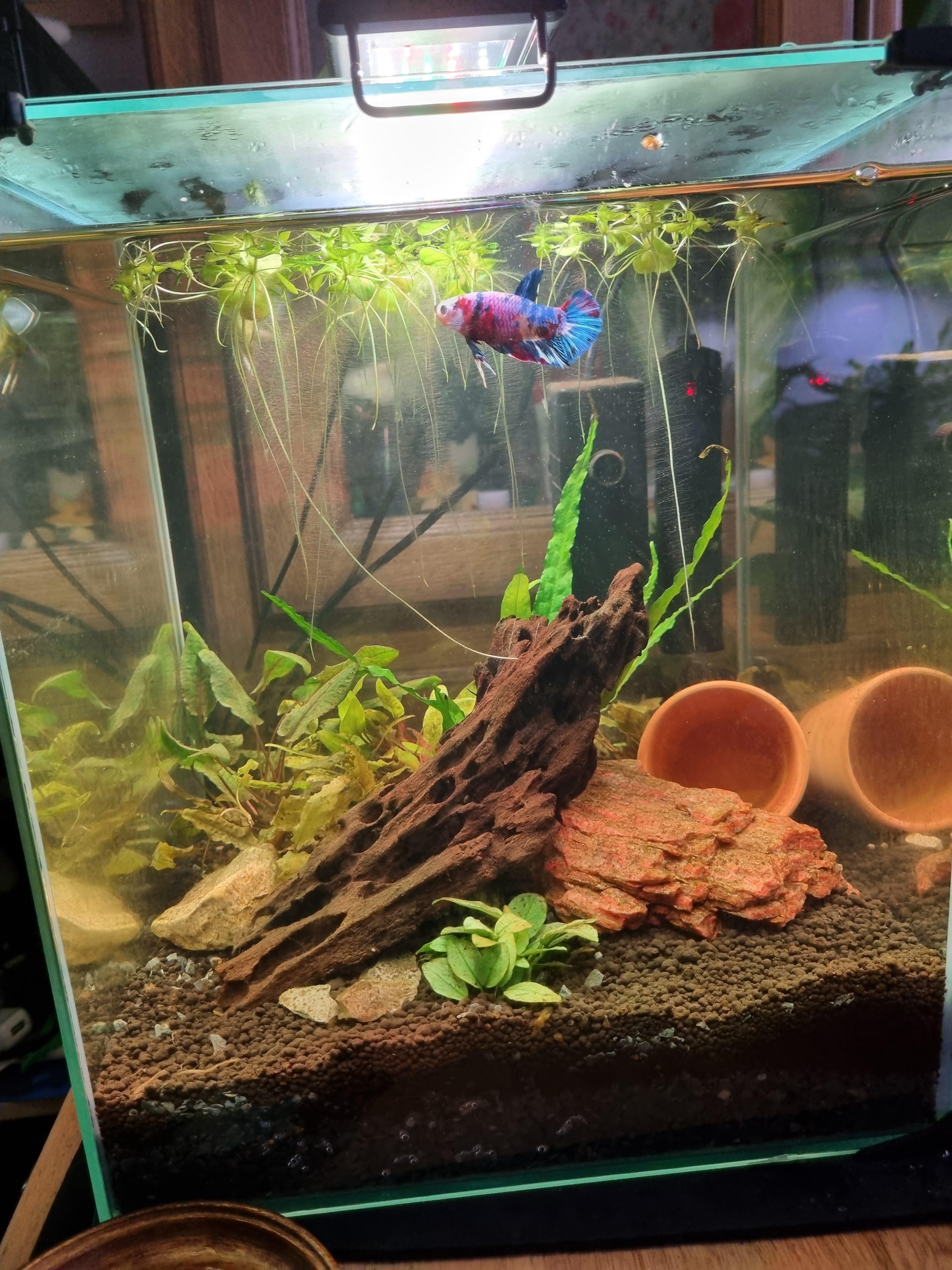 If that pot is terracotta, I hope you soaked it first, as it can leech toxins into the water that are very bad for your fish. If you haven’t, don’t worry! Take it out, take out about 30% of the tank water (you can use this to soak the pot in for about 24 hours) and replace with dechlorinated water.