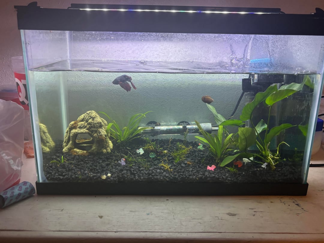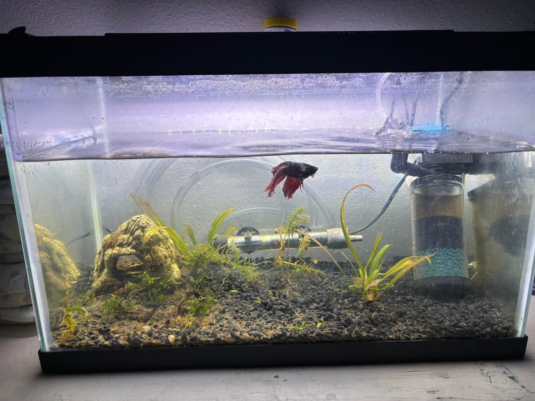 So a few things I’d like to mention, I know the plants are kinda sad and the water is low. I recently got the tank with the betta in it after it was neglected for a few months, since I’ve taken over the plants have slowly started coming back alive so I’m giving them time. The water level is the way it is because of the filter, if I fill the water higher then it pour out unfortunately, I’d point the spout in a different direction if it wasn’t so strong, keeping the water where it’s at is the only way I’ve personally found to keep it from blowing the cute guy around. It is a 10 gallon tank tho so a little plus.