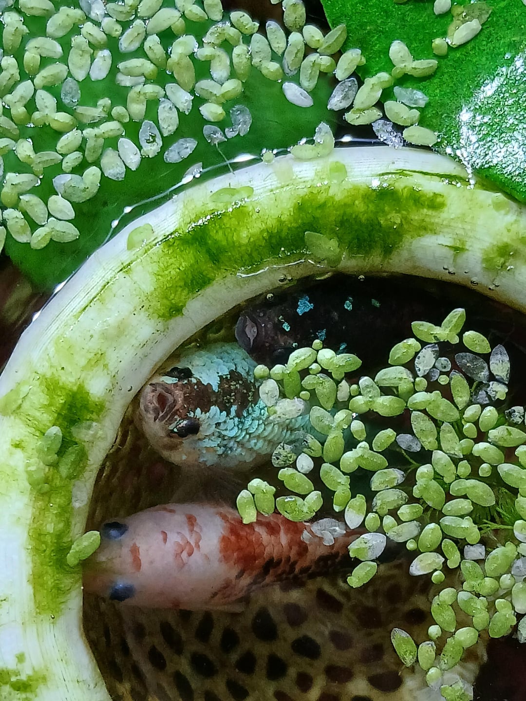 My 2 middle-aged koi bettas, Big Koi(pale with orange) and Firework(Black with blue) caring for my old koi betta, Nanny Koi https://www.reddit.com/gallery/1rrqay7 Posted by PeriThePurpleFrog