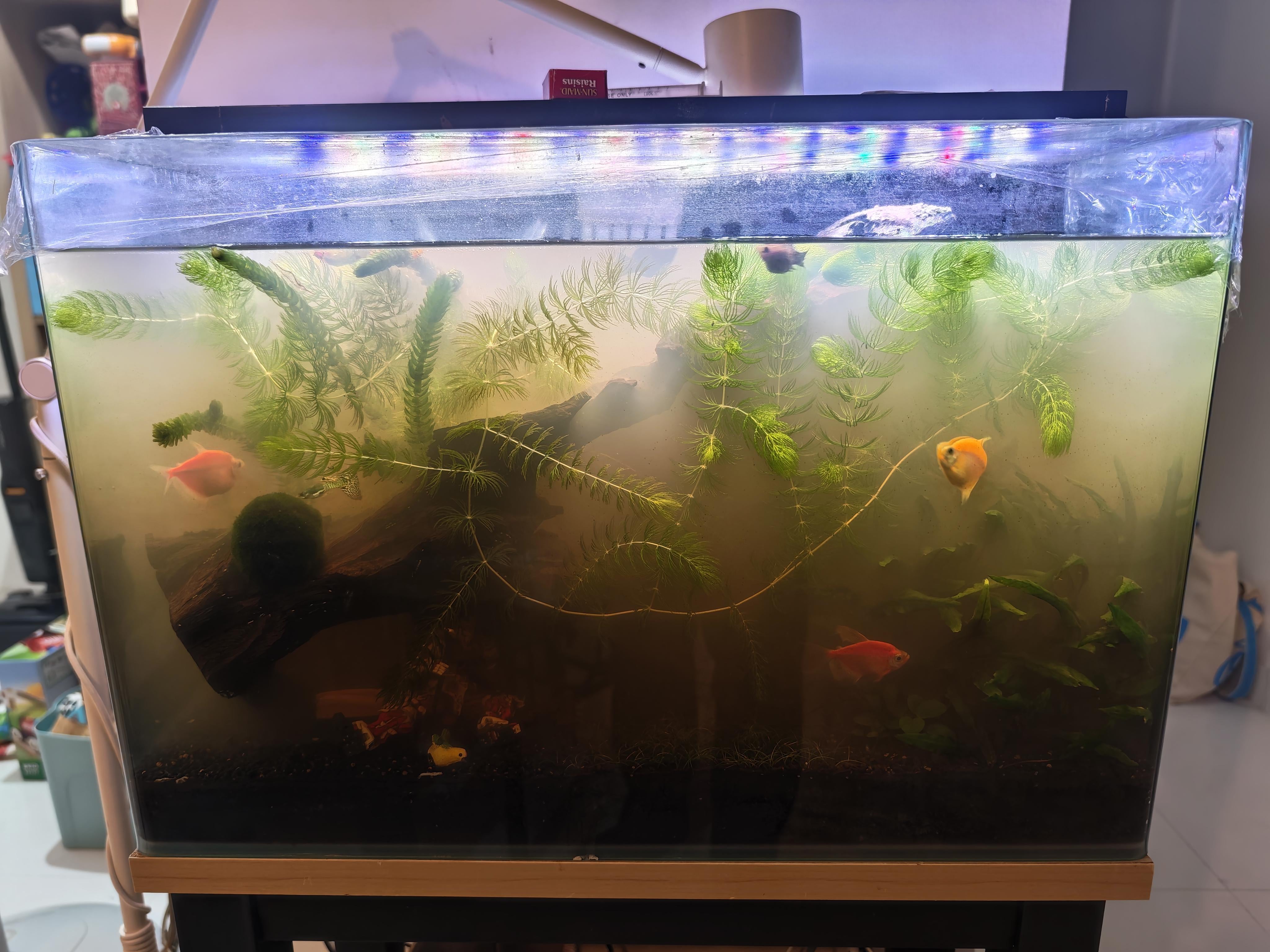 Livestock are all happy. Seems like a majority of shrimp survived. I see small baby shrimp which I assume are new hatchlings, suggesting that the water parameters are good.