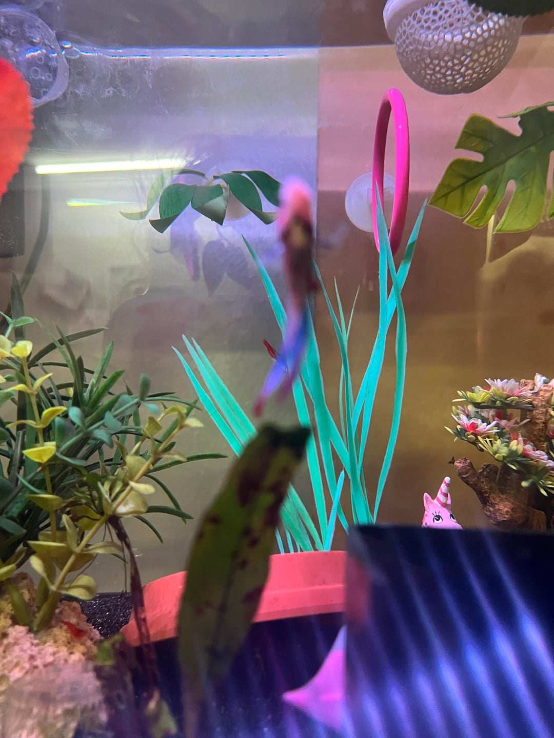 She’s in with a single neon tetra (who seems to hate other tetra’s I had to move them before he ate another) some snails and a bunch of shrimp.