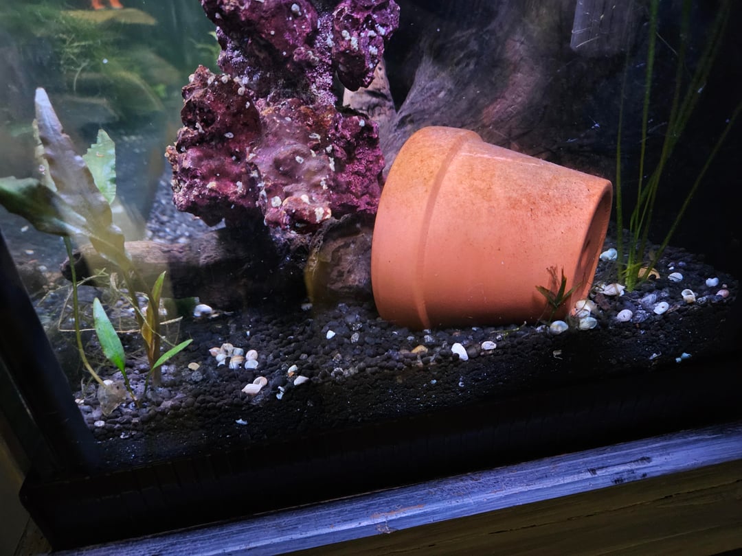 I bought a tank off marketplace a few months ago and it was full of ramshorn, solid clean up crew. But, a few months later… I notice my BGK is getting chubby… And, hey, where did all my ramshorn go? Found Merlin's stash of snail graveyard hidden behind his log during a water change.