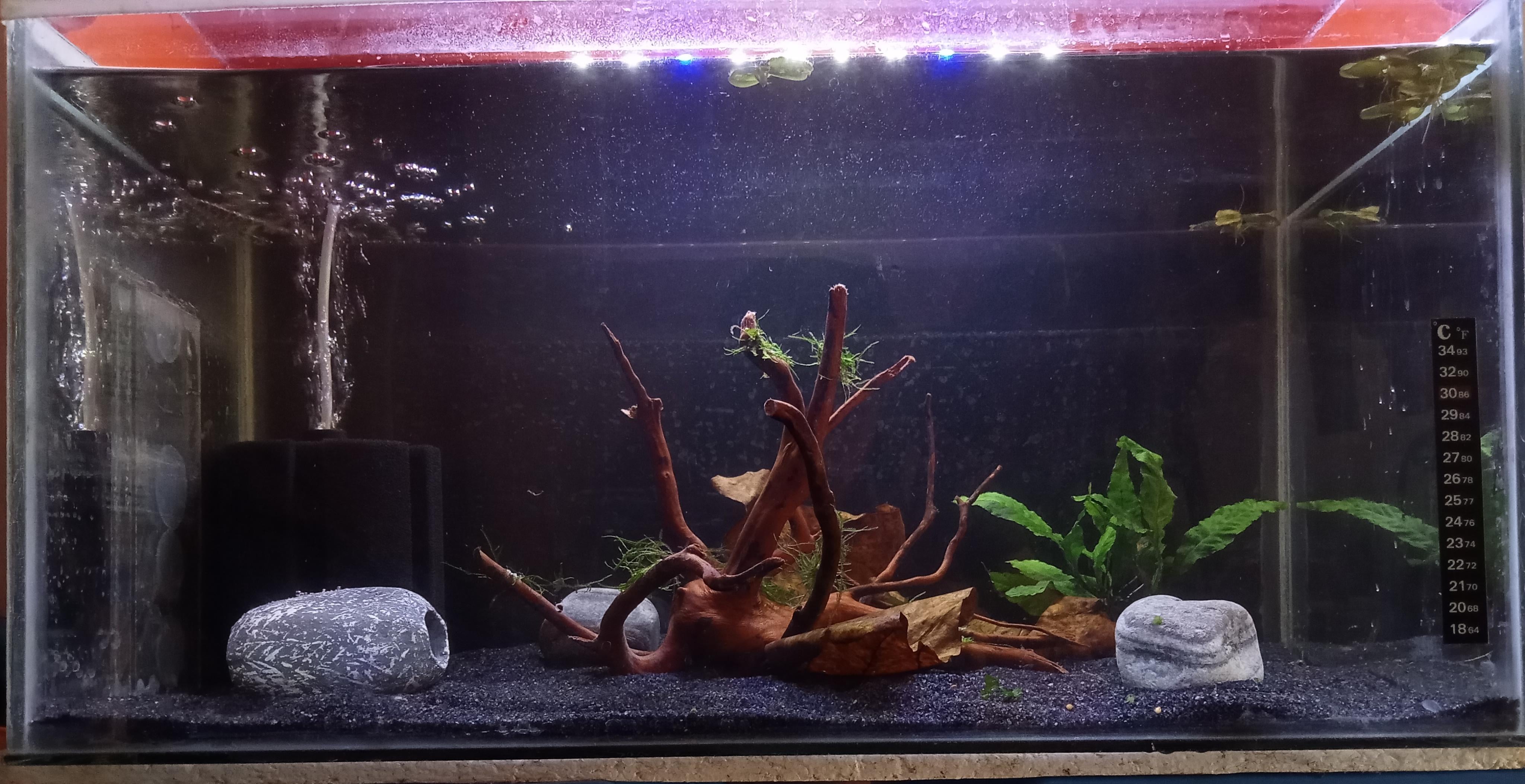 So I added some amazon frogbit, a drift wood and atteched some java moss on it in center, a cave on left side I wanna add a anubias nana but idk where. Also some of java moss is seprating from wood and floating Please help.