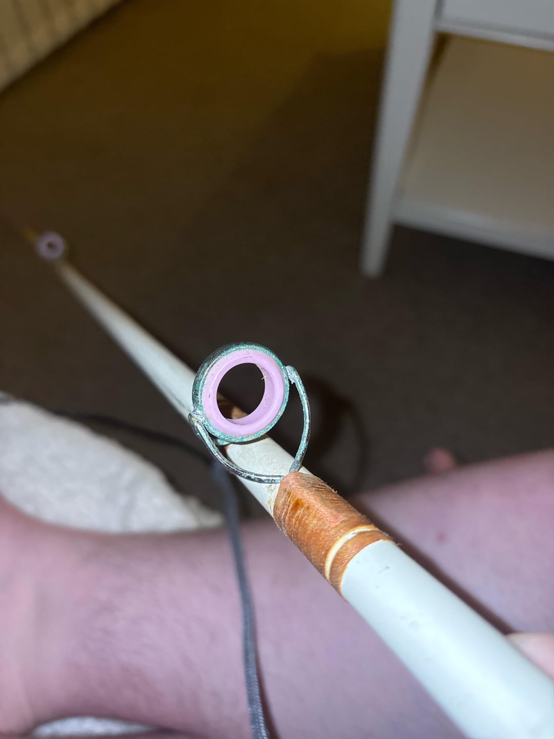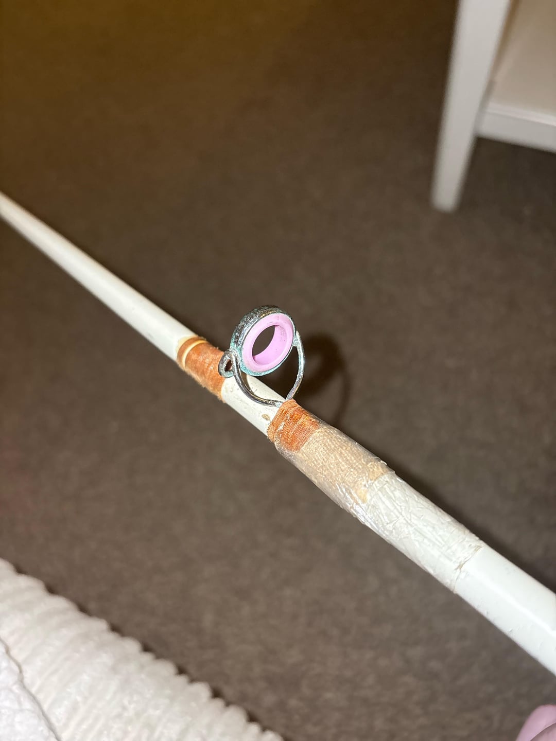Backcreekcustomrods.com has colored guides but not where the eyelet is pink like that. It’s gonna be pretty tough to find pink eyelets I’ve never seen that on a modern rod.