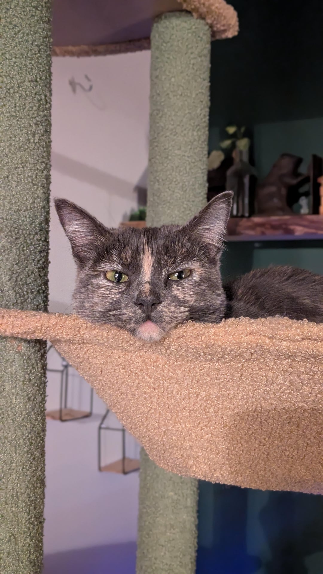 Lately she’d decided she belongs on top of the fridge, which would be fine by me IF she got down without breaking everything on the shelves near it.