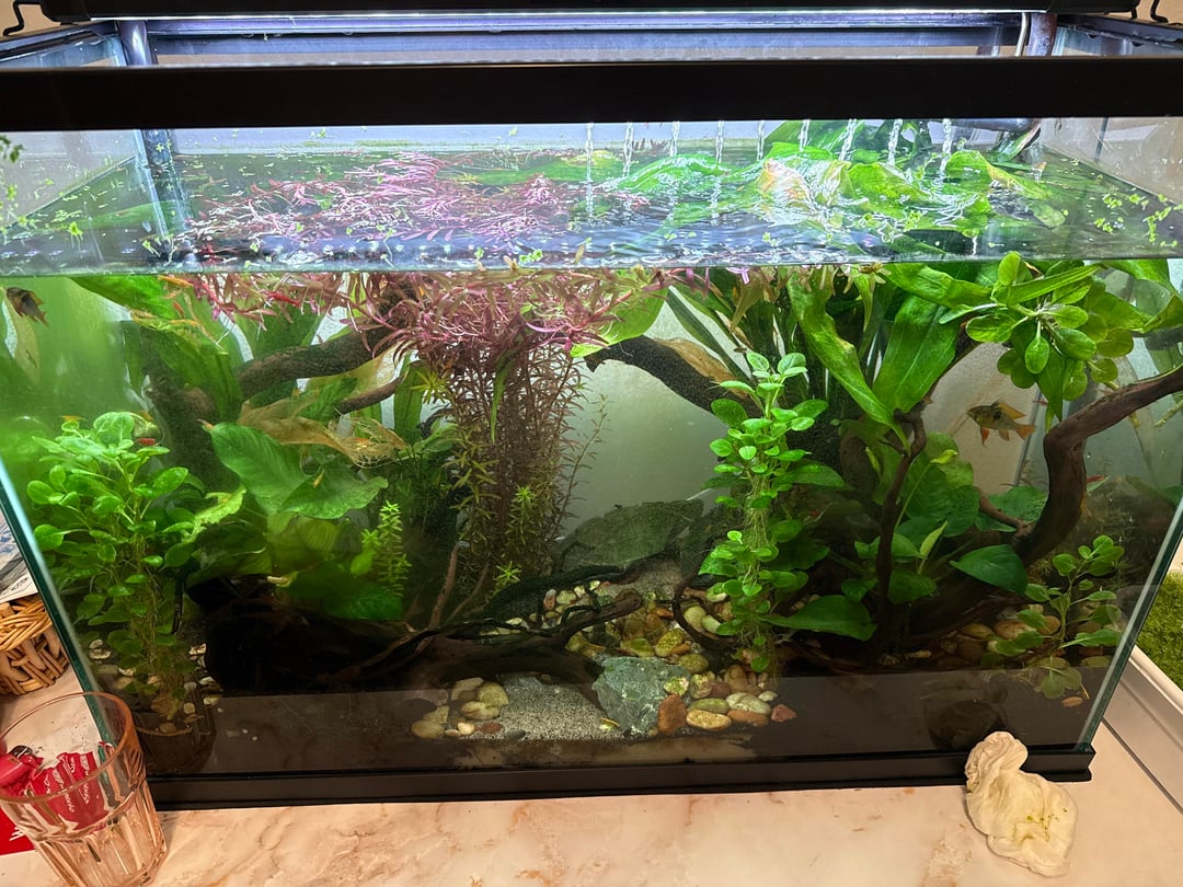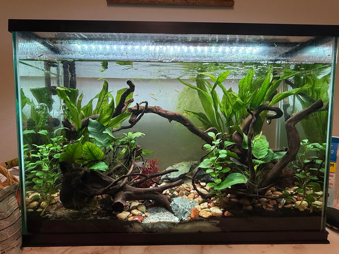 (Pics are random ones from the last couple months. My tank currently has the world’s most lucious amazon swords in the back, trimmed red plants, and a mildly annoying amount of green spot algae coating stones and wood.)