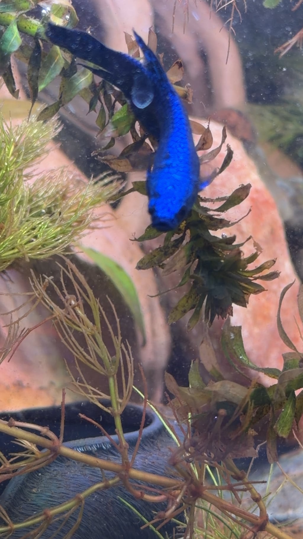 I didn’t have the water level that high and I was 3d printing a mesh lid while my glass lid is on the way) (also I was supposed to receive this fish (alien betta) on the 17th but it arrived on the 13th so I was under the impression I had time for its tank to arrive (spoiler I did NOT)) so the reason the fins are roughed up is cause this alien jumped into the koi bettas side and well… you see what happened.