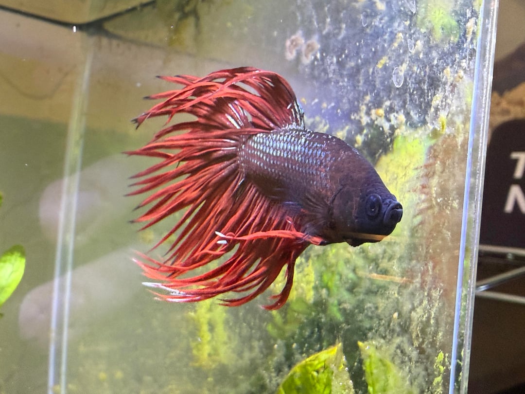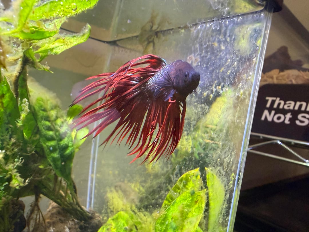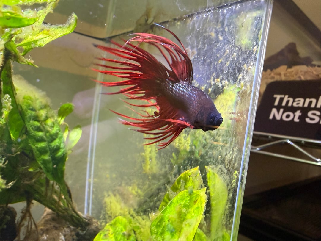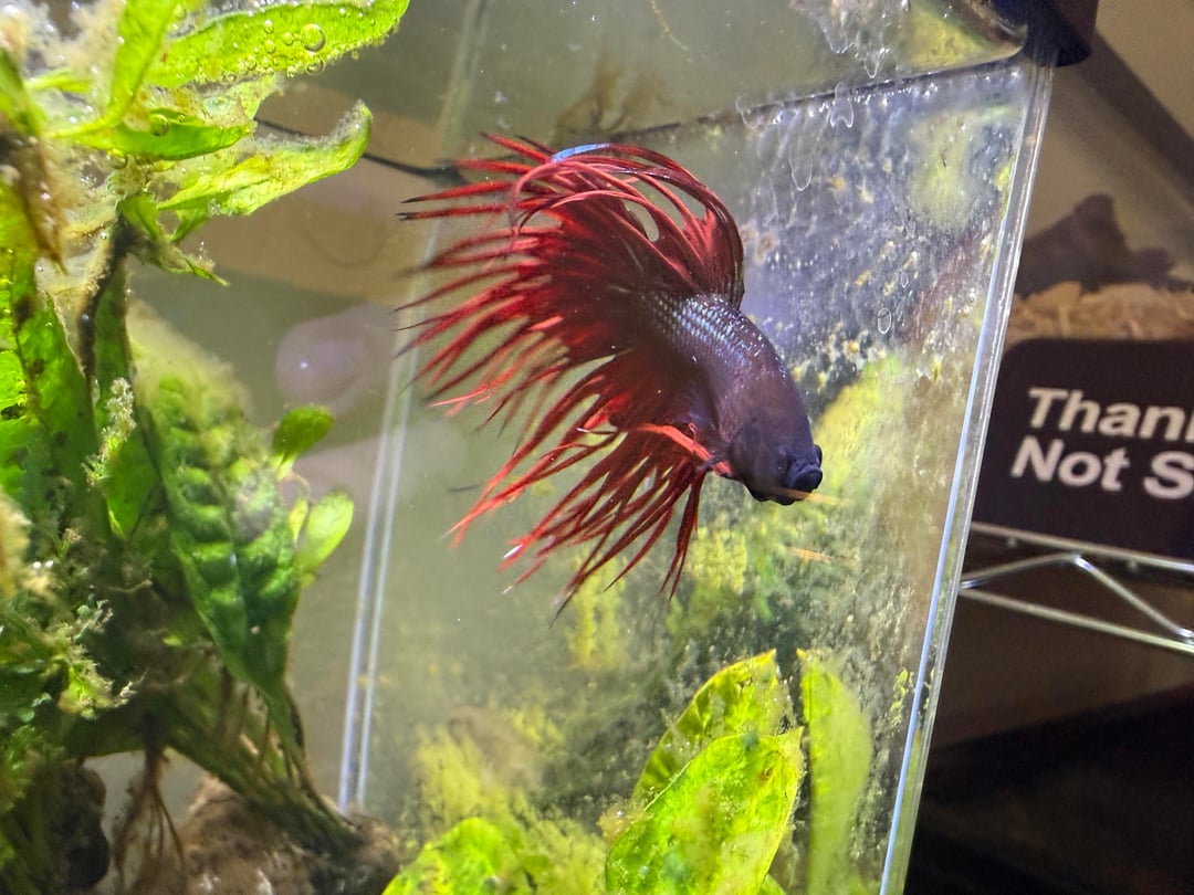 This is my betta, Pimp. He’s in a planted 3 gal planted tank (I have two filters set up, going to get a 10gal tall and use the second filter to “quick start” the new tank. This one will turn into a shrimp tank. The 3gal is a temporary!). Water parameters are good, plants are healthy. When I first bought him he was really lethargic, pretty skinny and his fins were a LOT shorter than they are now. Now he’s always jumping around the tank, making a massive bubble nest, his fins have gotten about 1/3 longer, and whenever i walk by the tank he tries to gaslight me into feeding him.