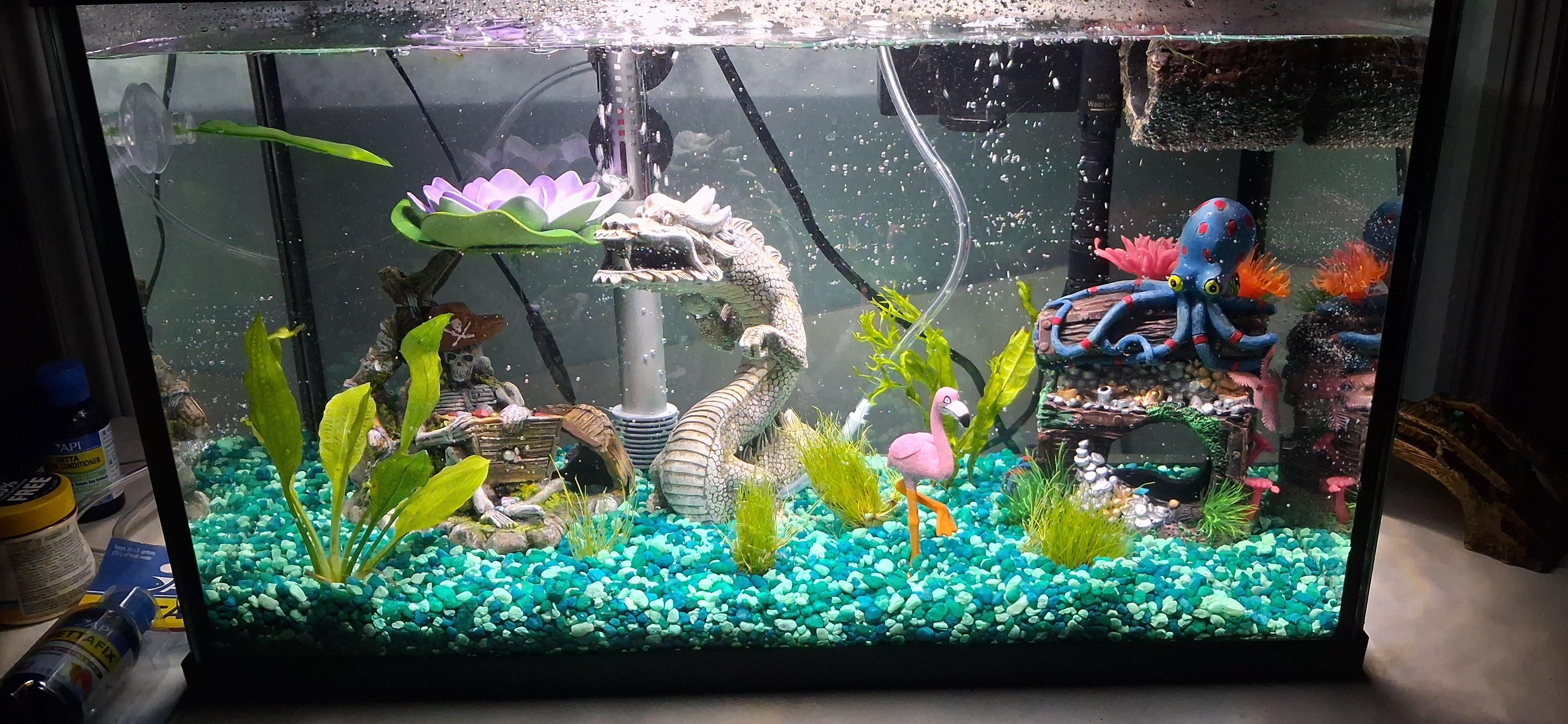 The tank is 10 gallons (no betta yet, im in the cycling phase). The dragon is a bubbler, both the pirate and octopus are hides with multiple compartments. I have a floating leaf, lotus and log for the betta to lay in/on. Plants are real (except the ones on the octopus). I'm relatively new at this, i haven't had a betta since I was a teenager. I'll be testing the water in a few days, but for now I put API betta conditioner in the water. Water is sitting at a comfy 80°F.