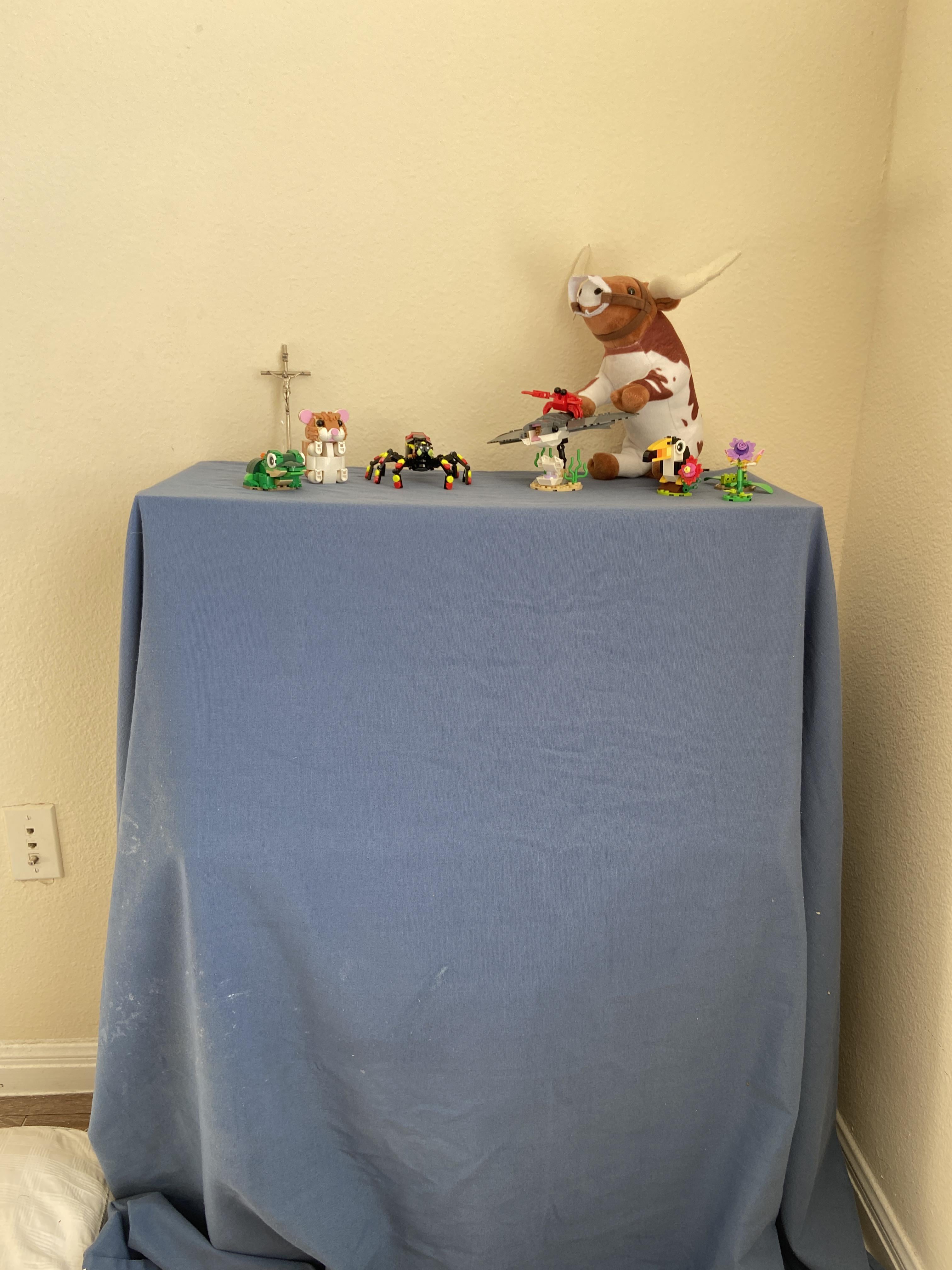 With the crucifix there you could make a little prayer table type of thing with tea candles and such if you want to look really convincing. It’d make more sense with the tablecloth and they’d be less likely to ask questions.