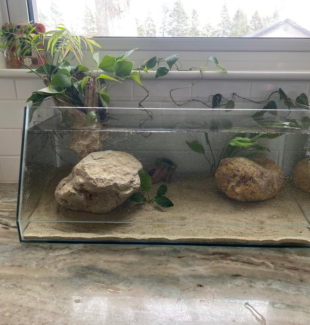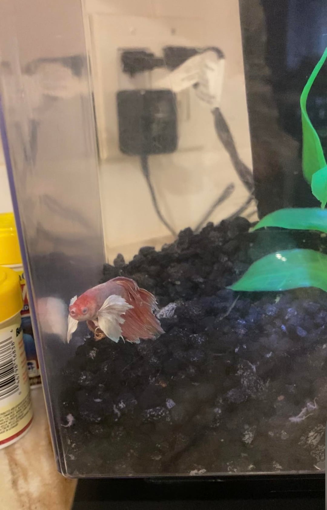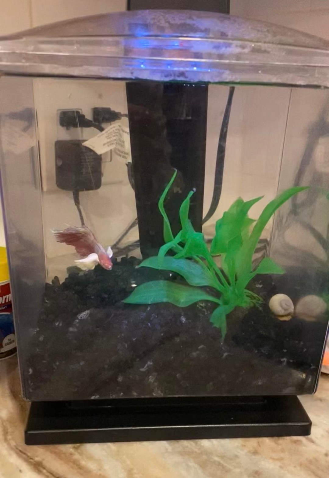 Hello!! My mom went to petco for some other errands and saw this betta fish, and felt bad (bless her heart) and bought him this tiny tank (first pic). I’m the type of person that really gets upset about how animals are treated because they can’t speak for themselves. I know where her heart was, but it’s just that she didn’t even take the three minutes in store to google how big of a tank they needed. I kind of shamed her over the phone about when I don’t know MUCH about betta fish, but I had this bigger fish tank I brought over for her and a water heater. She went out and bought the lights, filter, water conditioners and the other stuff idk the name of, brine shrimp, and some snails (idk why). What else should she add?