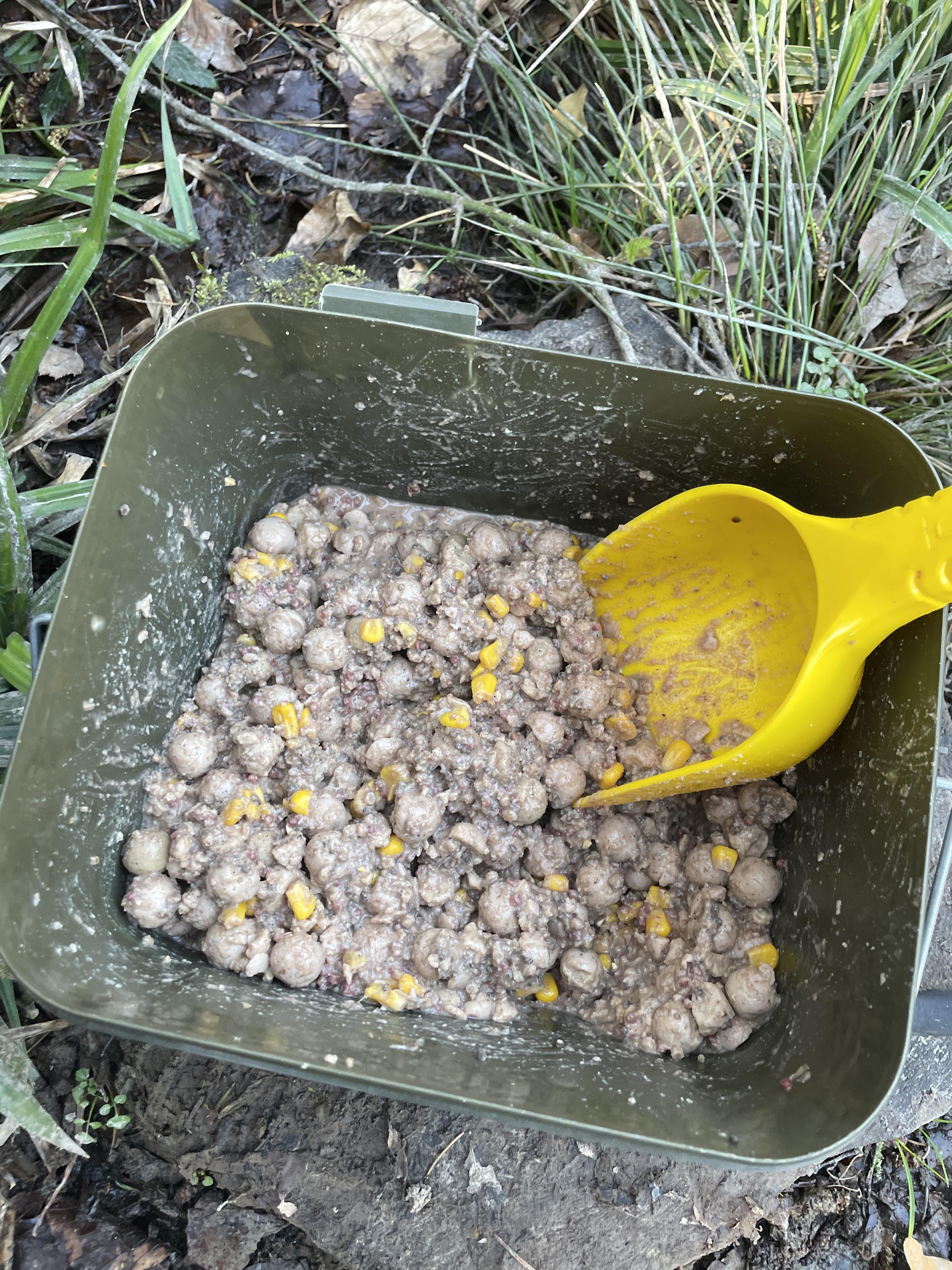 What’s your opinions on using mixes like this as winter starts to fade away? This is Nash Citrus 15mm boilies some whole and some mushed up, sweetcorn and some Parker baits og fruit and nut minimix pellet. Made a lovely cloud when I dropped some in the edge but what’s your opinions on putting bait out this time of year or are you using single pop ups?