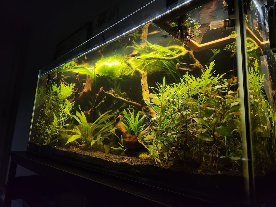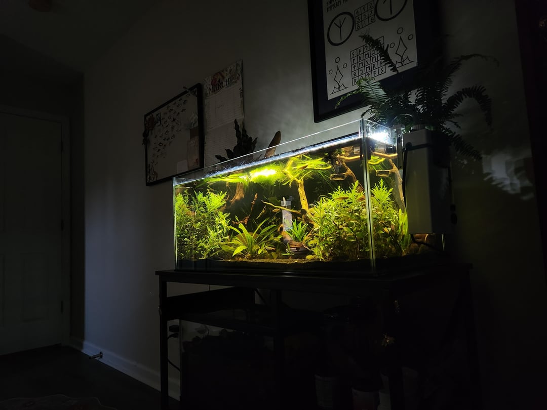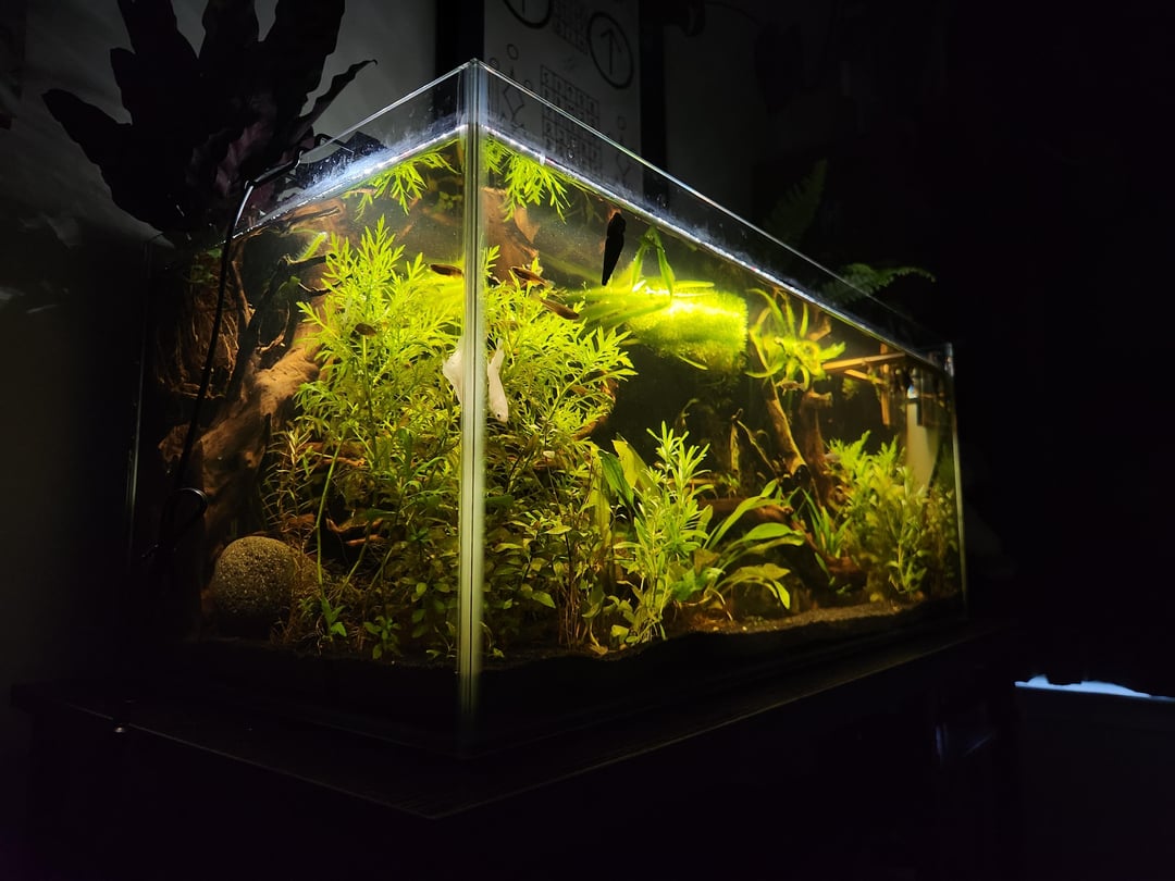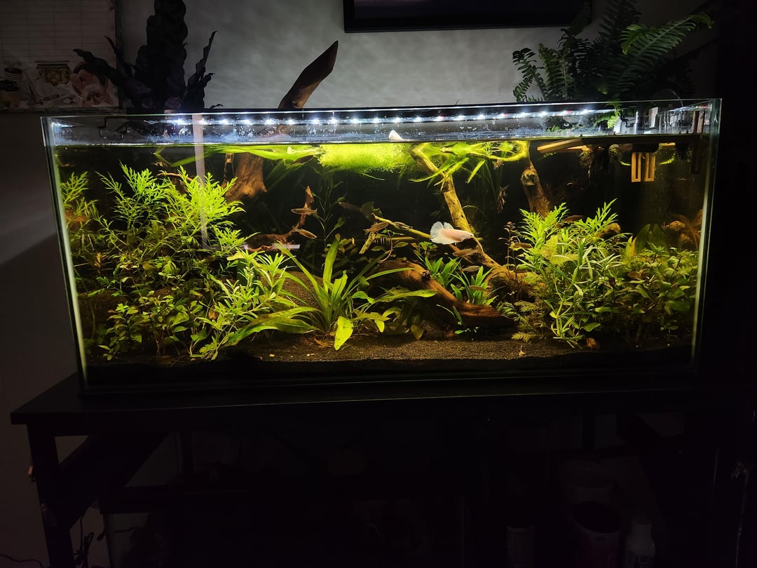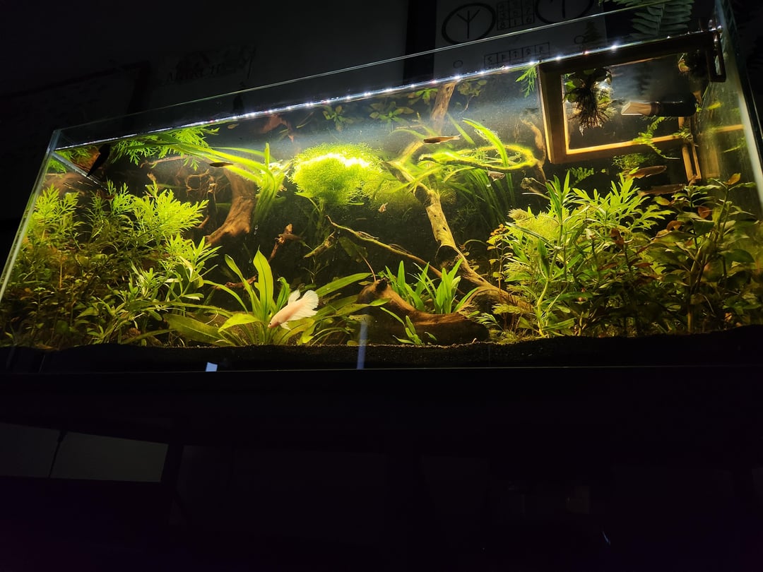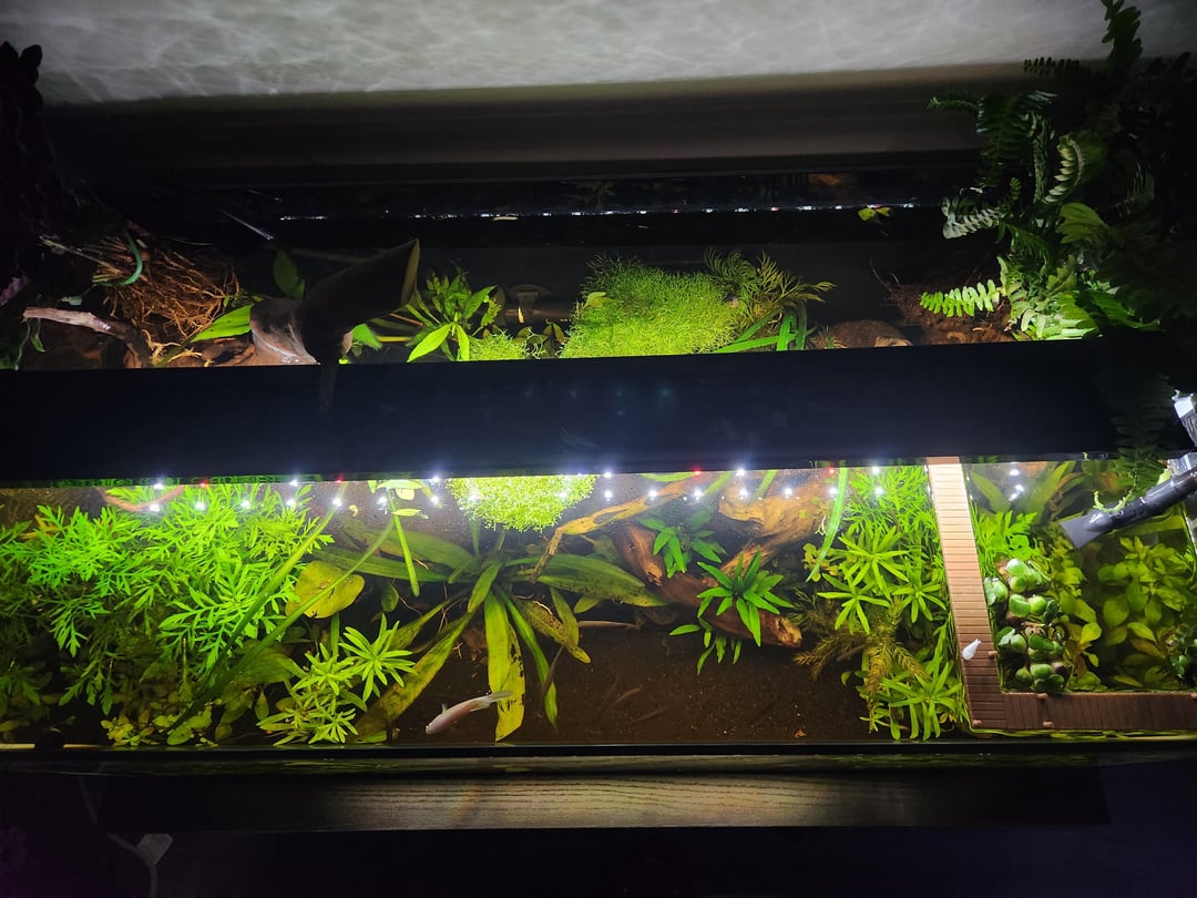 couldnt name all the plants in there but the floating plants are riccia, a teeny tiny amount of duckweed, and 3 dwarf water hyacinths. Emerged plants are rattlesnake and a type of fern. i do have plants in the back they just havent grown in yet and honestly even if they dont im kinda digging the planted sideburns look so ill let them be, it makes fishstick pop.