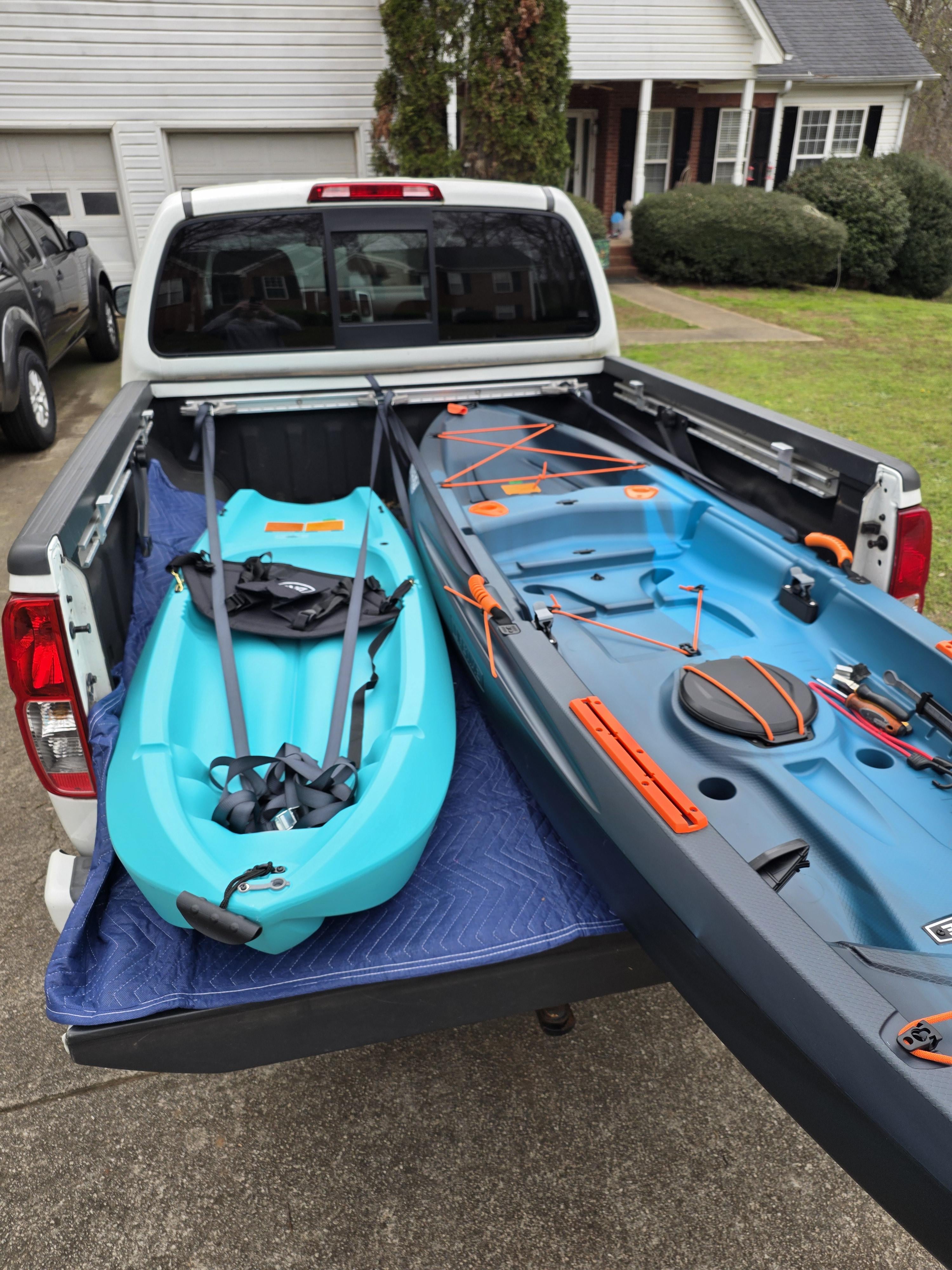 Trying to figure out a good way to tie me and my daughter’s new kayaks to the truck bed but idk if this is good or not. They can’t slide out but I don’t have a way to secure them to the floor of the bed my truck, it has no tie downs in the corners like most trucks. Y’all think them being secure to the back like this will be ok?