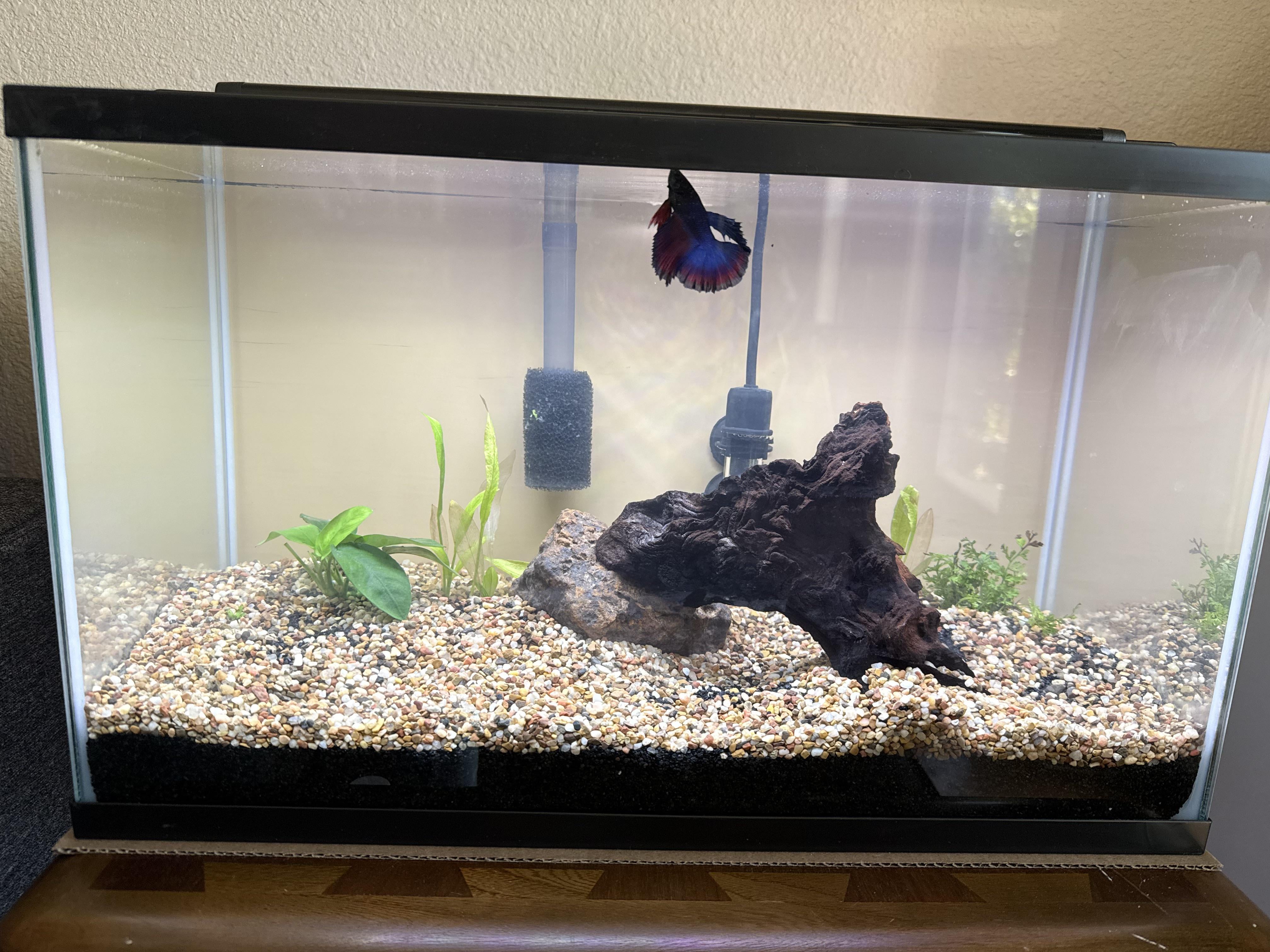 3. My betta really like those tubes that you can suction to the side glass, they also like Anubis nana plants, which it looks like you have one there on the left, but don’t bury the rhizomes or it will die. Just the roots that grow off the rhizome, or glue or tie it to the wood. They dont need their roots planted to thrive. I just snap them into suction cups on the glass. Id recommend lots more plants as it will feel more secure. Looks like a great start and your betta is a pretty boy!