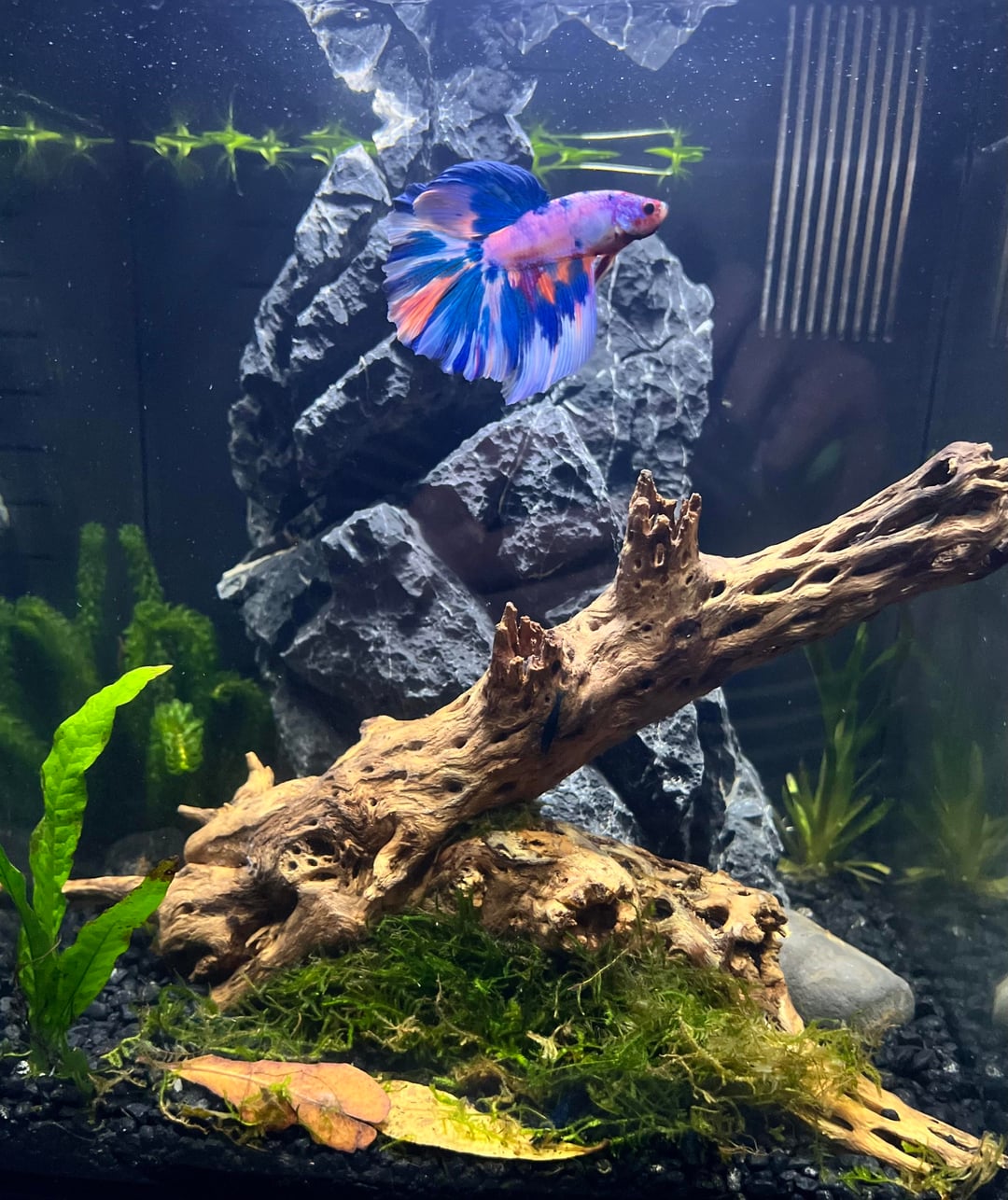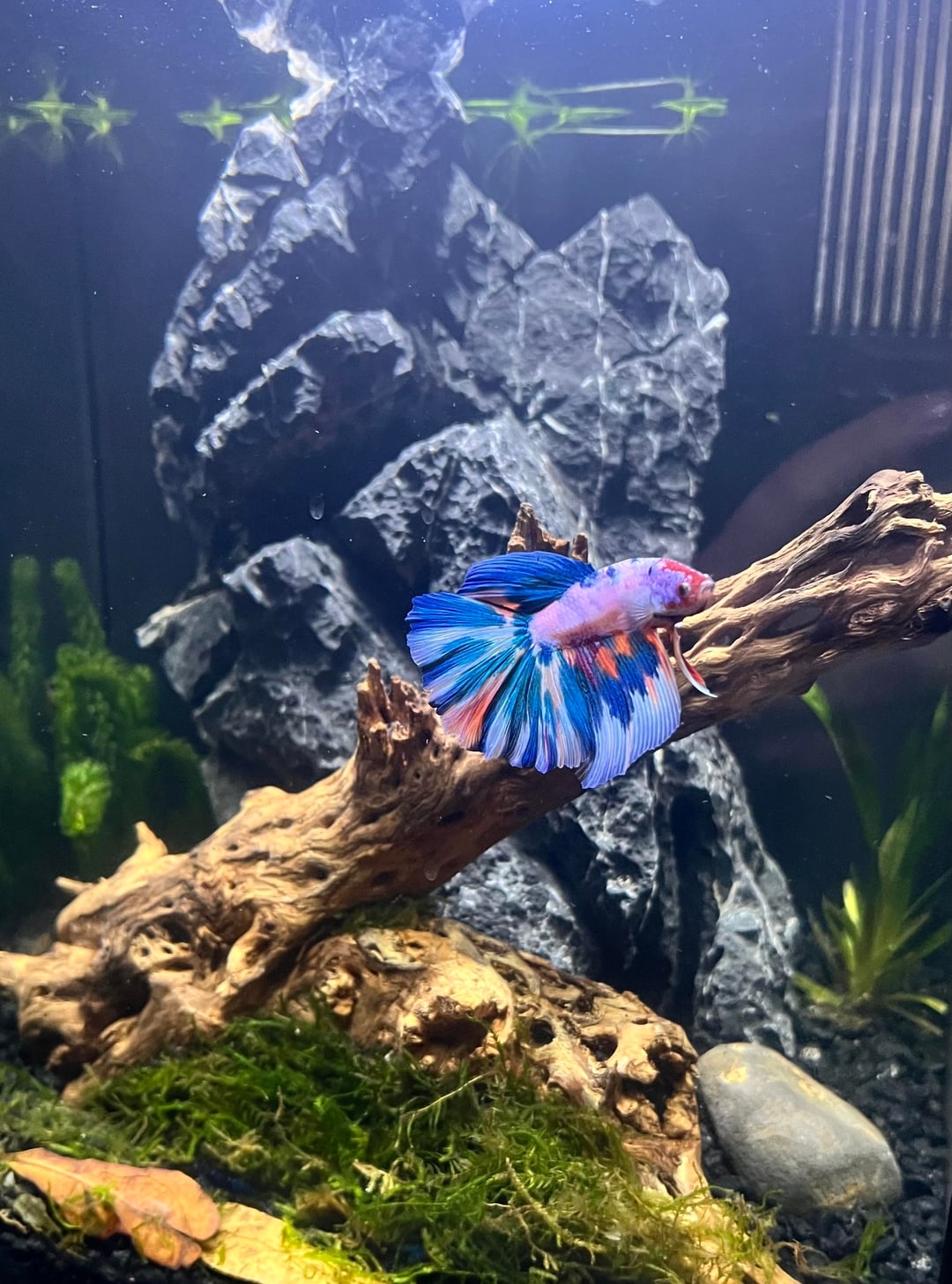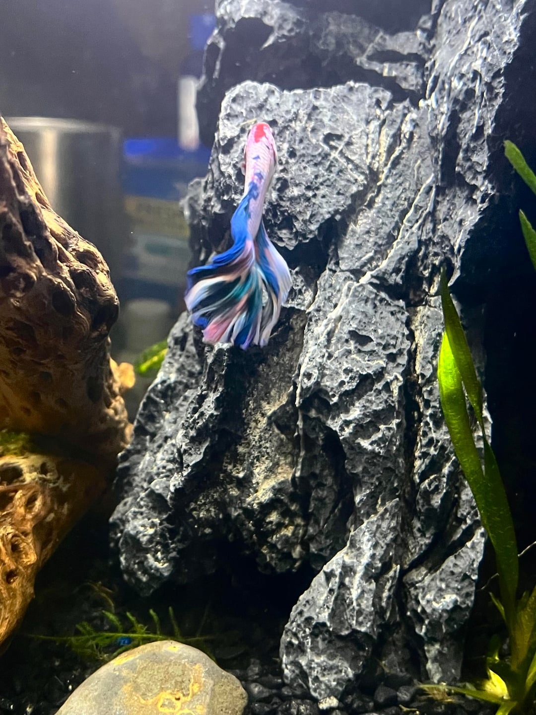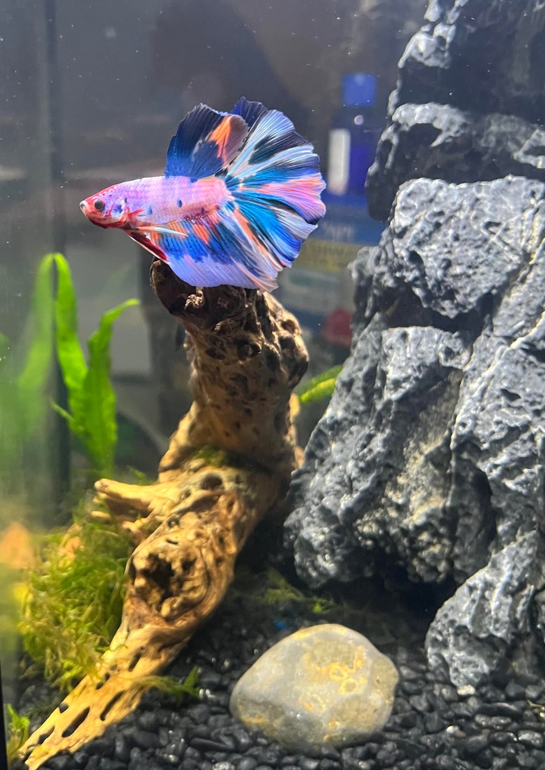 This is my first personal betta, I “inherited” a betta fish in a 2 gallon tank as a teacher coming into a new classroom. Because I knew that people mistreat bettas without knowing what they’re doing, I did a ton of research to try and give him the best life I could, set him up a great planted 5 gal tank, and after seeing his turnaround, I fell in love with his active personality and curiosity. So I bought another tank, set it up at home around little over a month ago, waited for my parameters to indicate that it was cycled, and then ordered this little guy! I wanted him to be colorful to stand out against the black substrate and rock… he definitely delivers. I’ve just been watching him explore and get into every little hiding spot I’ve created. I’m so excited to have a little guy at home to watch on the weekends! (His name is Diva… fitting I think)