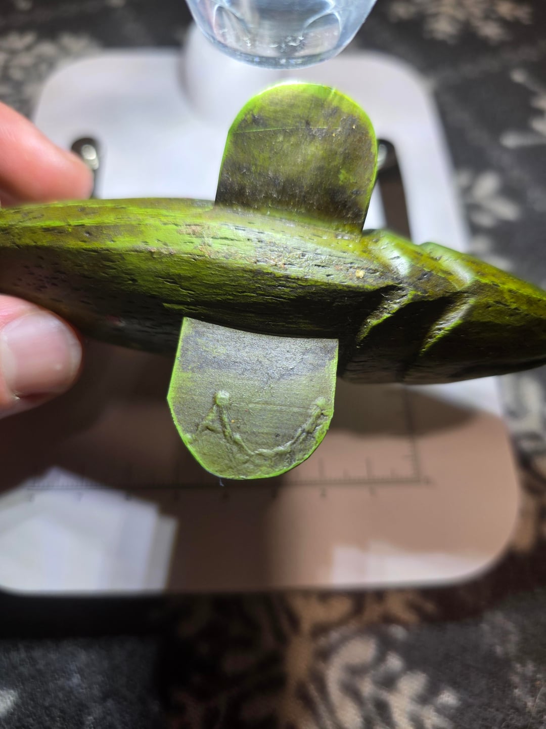 I got this brook trout or brown trout ice fishing lure and im trying to figure out the maker, all I can make out is the A but im not sure if that line is attached to the A or if its supposed be something else. This is a all wood lure. Any help would be useful.