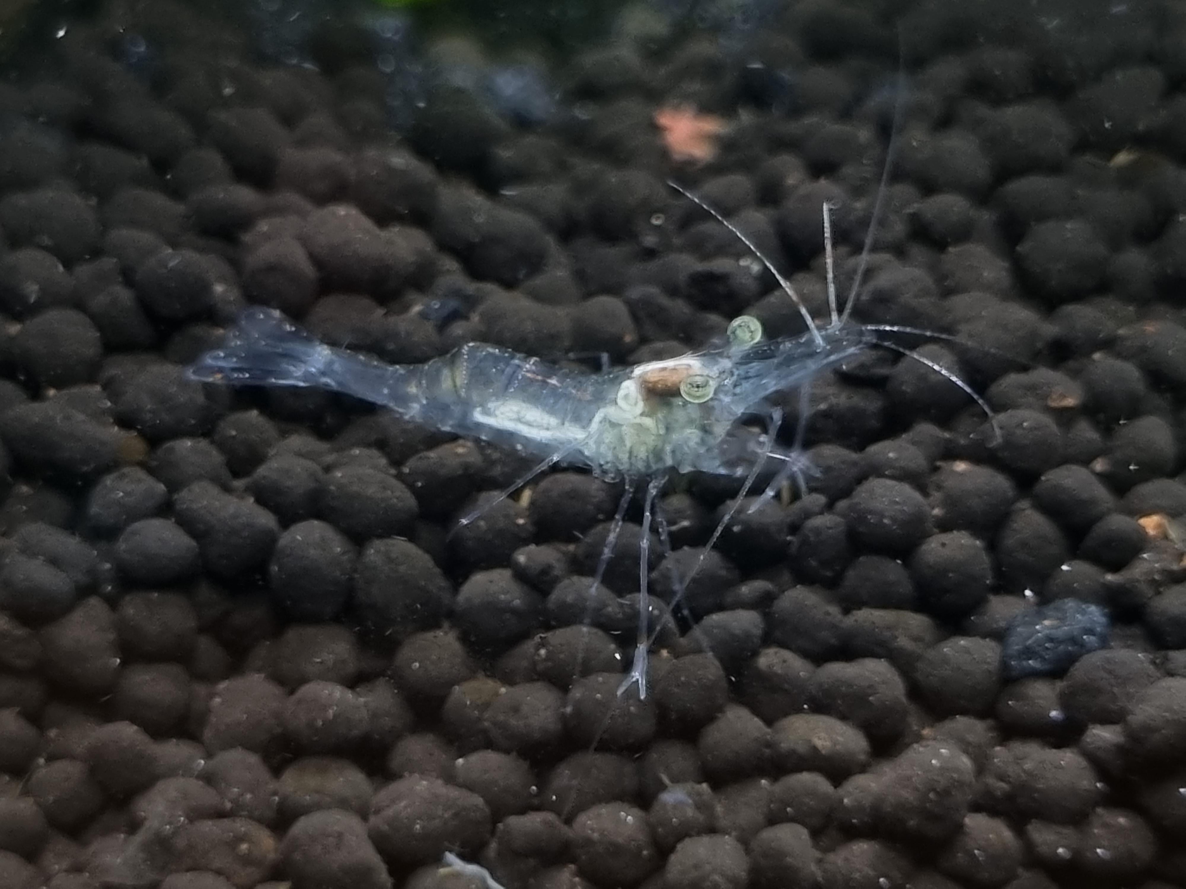 A saddle would show as a green lumpy mass within the body of the shrimp. The females are also larger. Your ghost shrimp is infected with a thread worm btw. See that white line coiled up inside him? Eventually that worm is going to burst out of him.