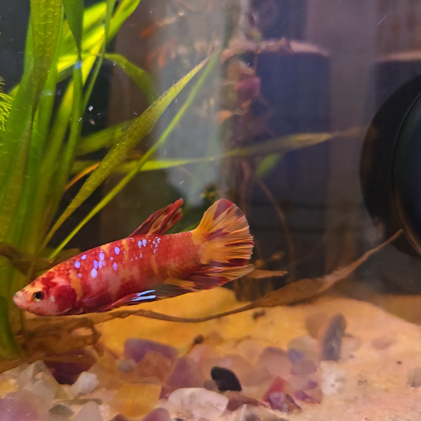 I am so freaking happy to introduce my first betta to his new home. After the same type of betta was DOA when I ordered one online, they sent another which was also DOA. I didn't ask them for a replacement, I just reported it hoping for a refund. I went to my LFS today to pick out a betta after not wanting to order another online. And there he was, I seriously think it was meant to be. He looks just like the one I had first ordered. His name is Prince Zuko, or just Zuko. He's a curious, happy boy so far. I could not have found a more perfect betta. Any tips or suggestions on feeding? What do you feed your betta? I have some betta pro shrimp patties pellets. Lmk your thoughts and advice 🙂