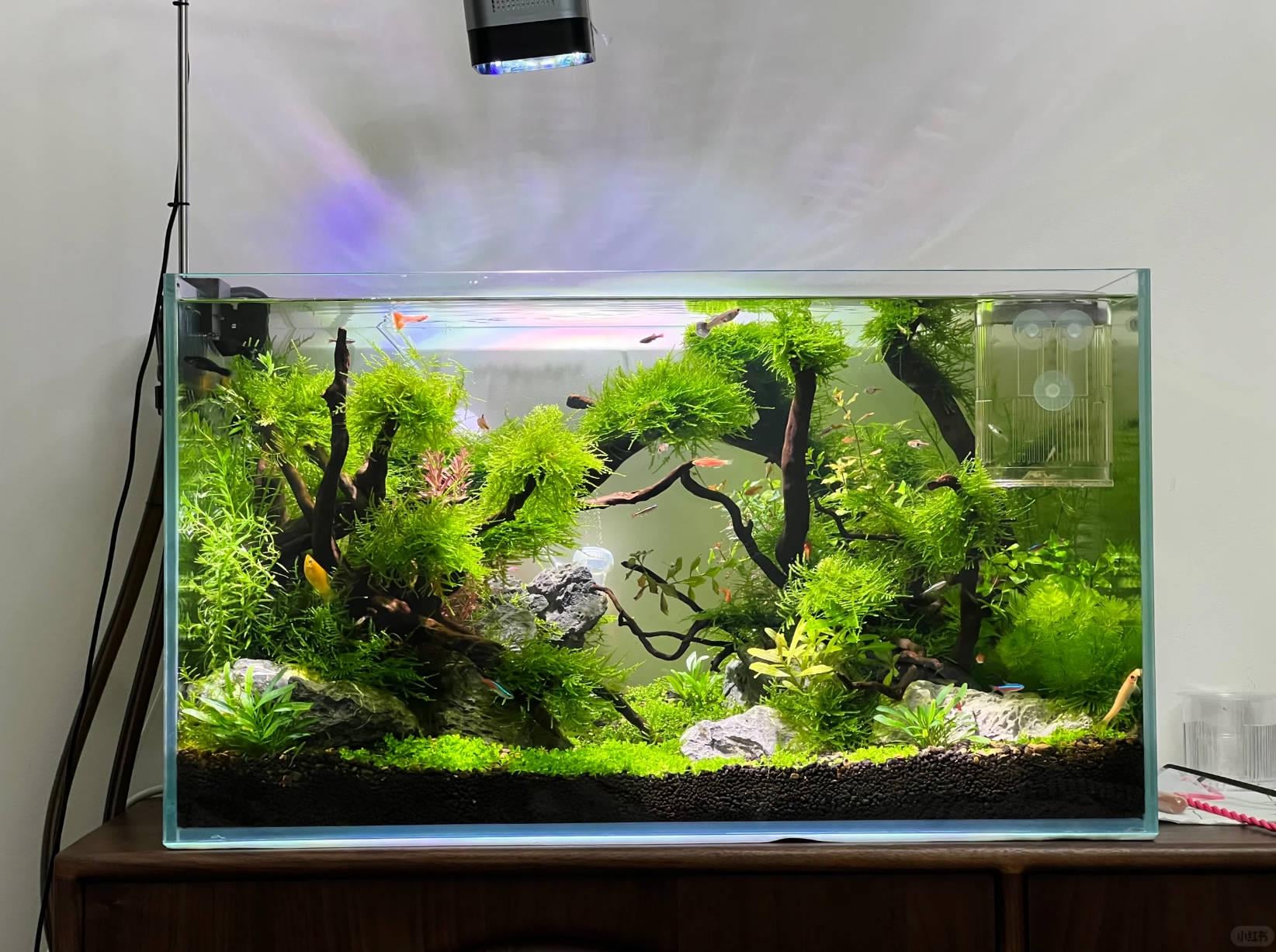 After subjecting the tank to continuous, high-intensity lighting for 24 hours and infusing the water with carbon dioxide, the aquatic plants finally began to grow; however, they now require periodic trimming.