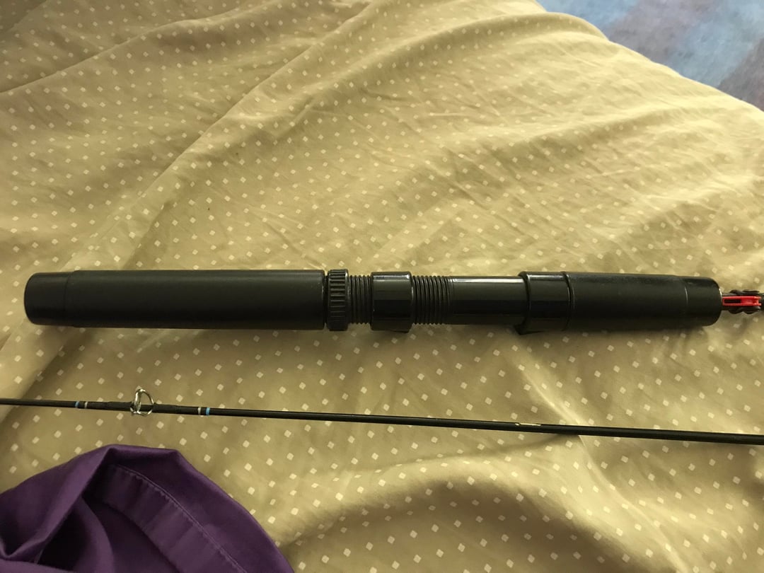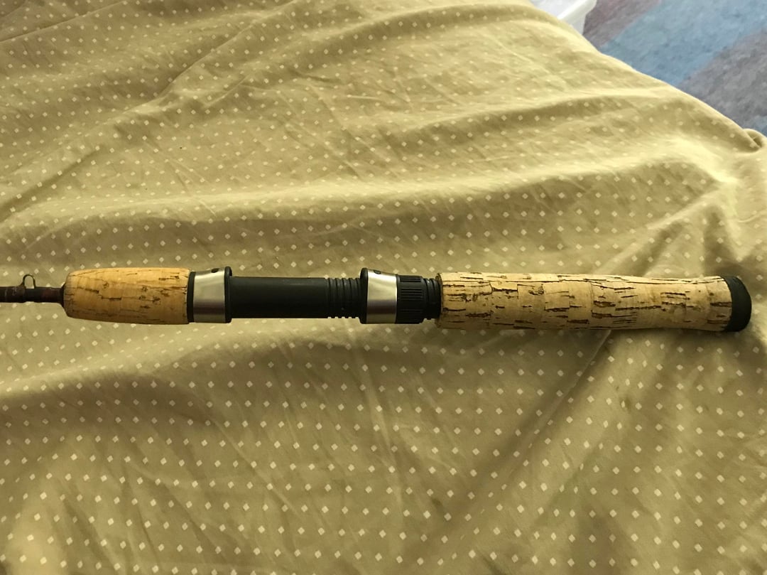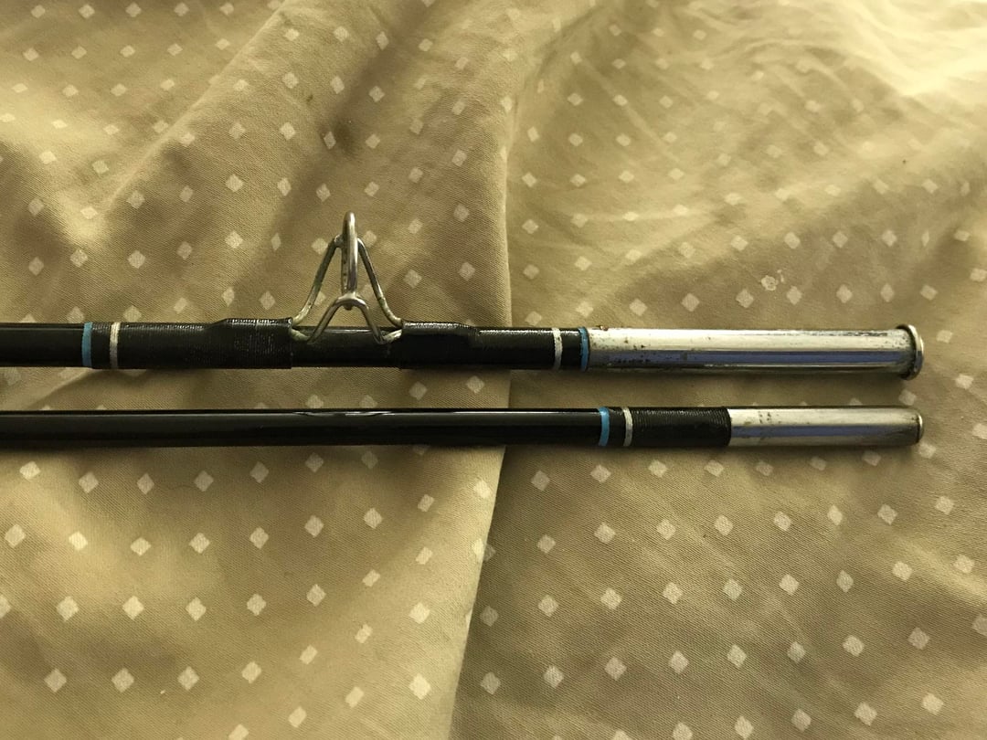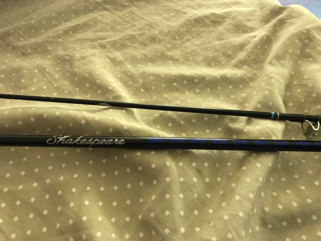 The first is a Shakespeare rod from the 1980s. It has blue stripes and a single metal ferrule. It’s 5’2” in two parts.The text on the side that would give me the action, line weight, lure weight, etc. has all worn off.