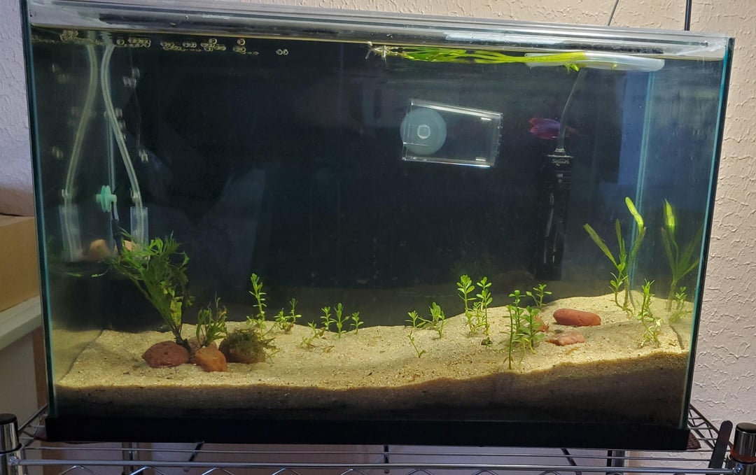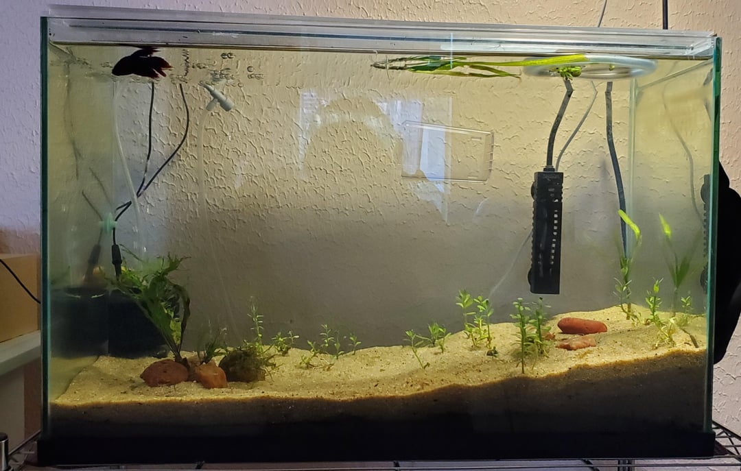 The back background makes the sand and plants look really good, as well as hiding wires and equipment, but then my beloved betta doesn't stand out. But with no background all the unsightly stuff shows. Any ideas on what to do?