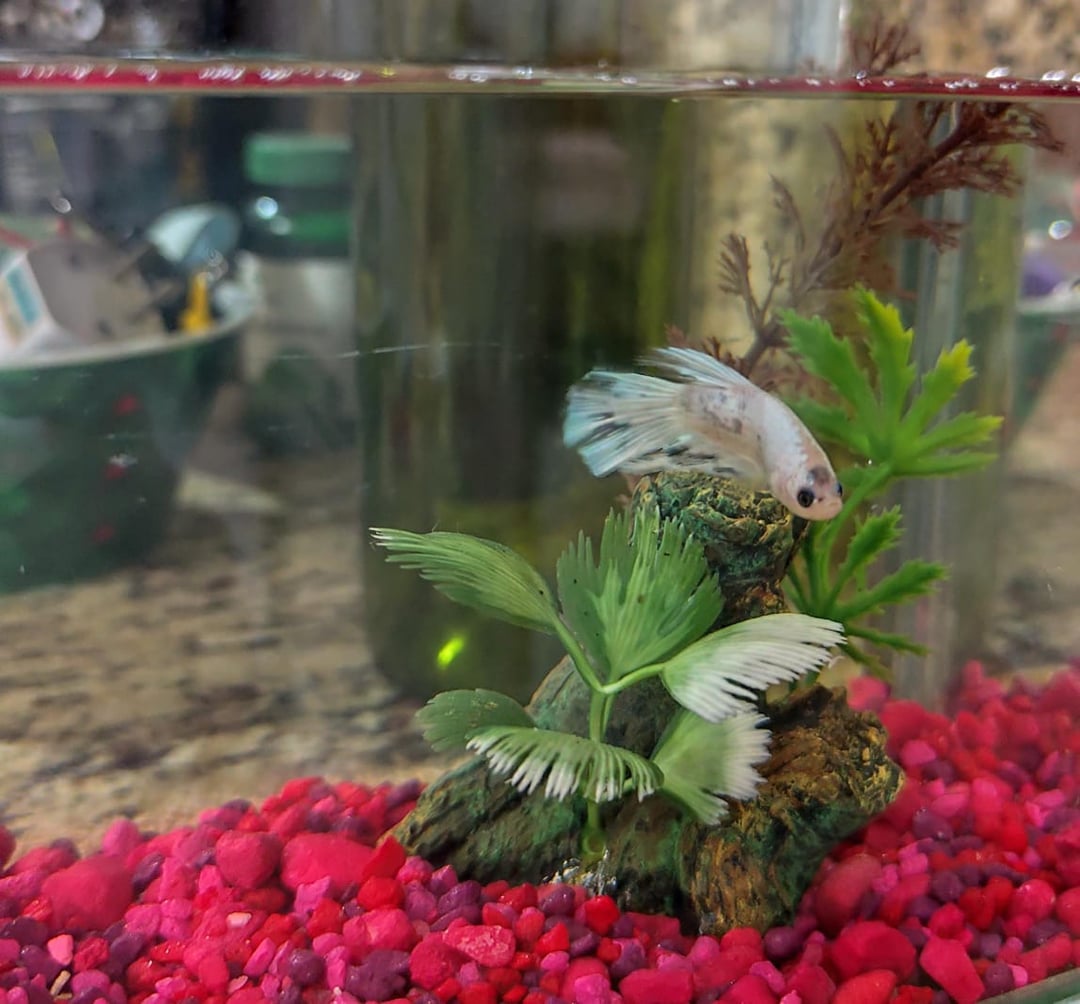 1. Context on the pictures: changed his decorations since I learned plastic plants can harm their fins, bought natural plants for him.