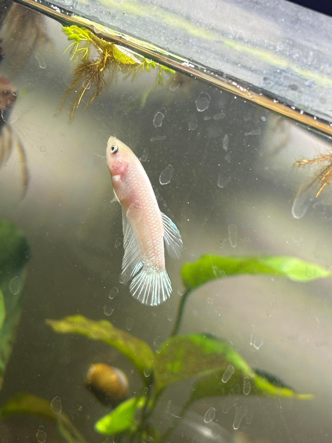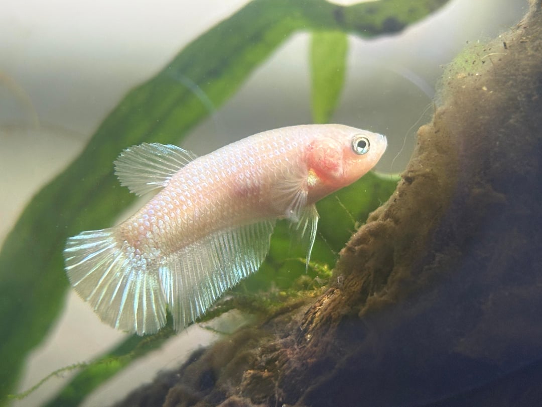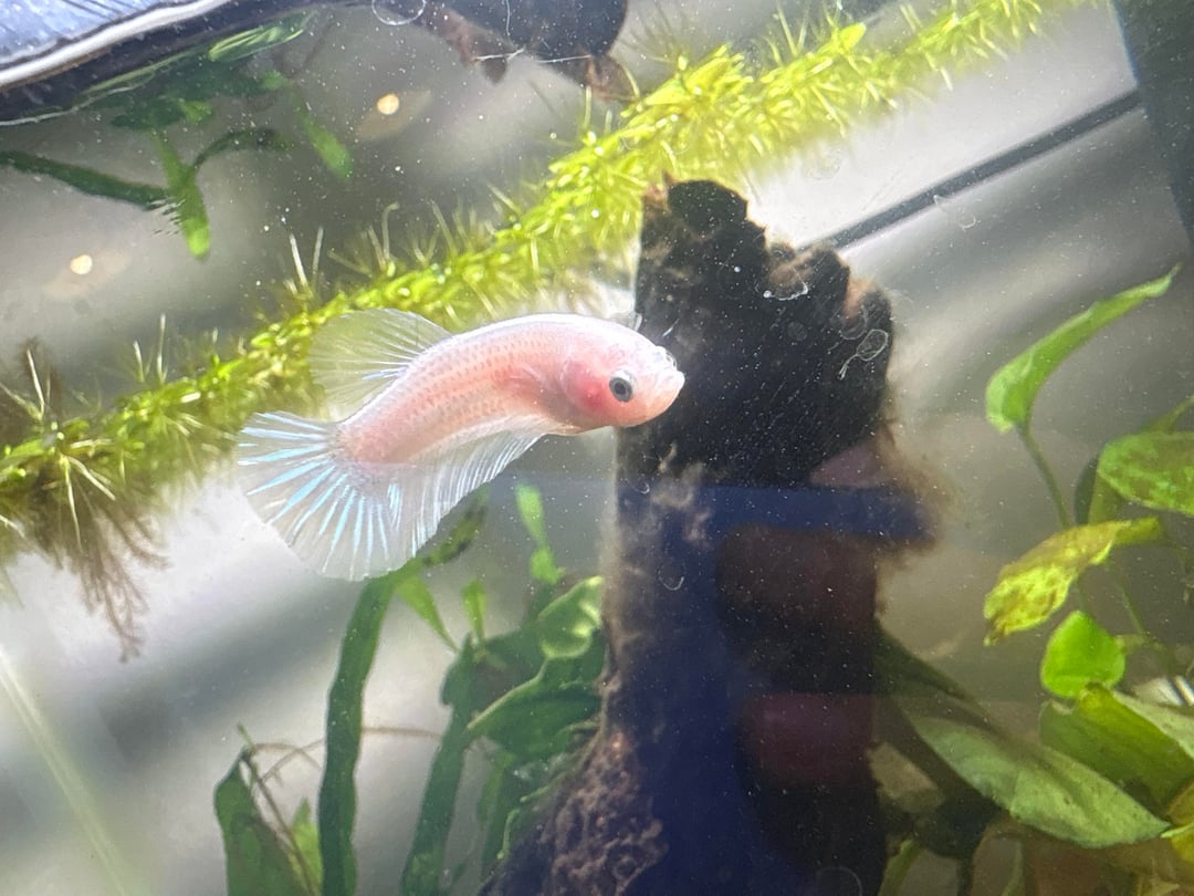 I got this betta for 1$ at Petco he was sold to me as a “” baby boy”” I chose him because he stood out from the rest it was his icy blue eyes that made me choose him, what color is he? And what will he look like as he matures? ( yes he’s eating a shrimp 😭)