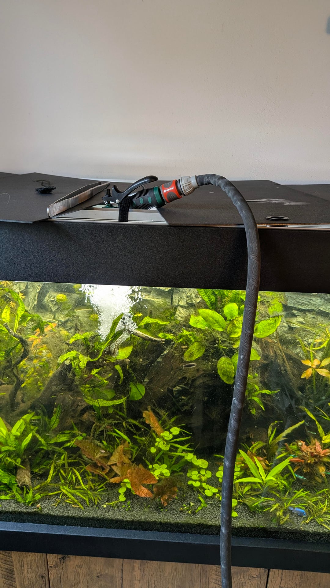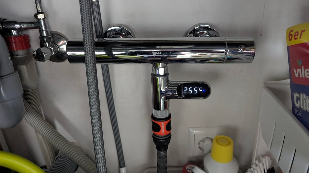 When I renovated my kitchen, I had the plumber install a second tap, hidden under the sink. I fitted it with a garden hose connector and a temperature sensor, which is actually meant for showers. This way, I can fill my 540-liter tank without having to carry a single bucket.