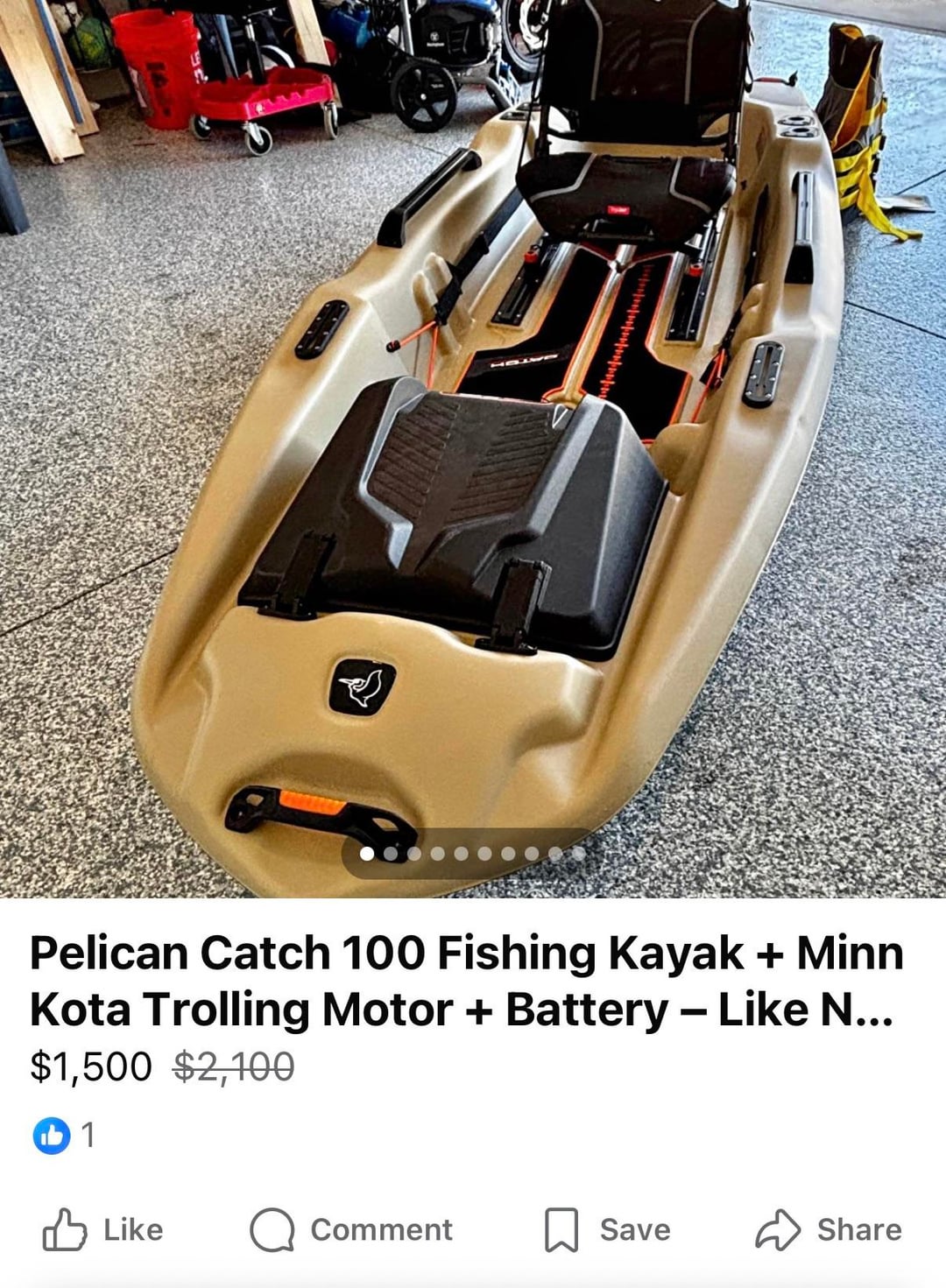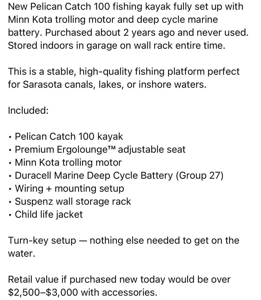 I know there are others who know more than me on this subject but I don’t think that’s a good deal for used. That pelican is 600 retail and assuming the minn Kota is 12v based on the Duracell battery, you can get it under 200, same for the 12v battery. Seats and miscellaneous won’t be worth hundreds, so you could rig the whole thing up for 1250 new probably, but 2 year old? Nah there’s a reason why he went $800+ lower original ask