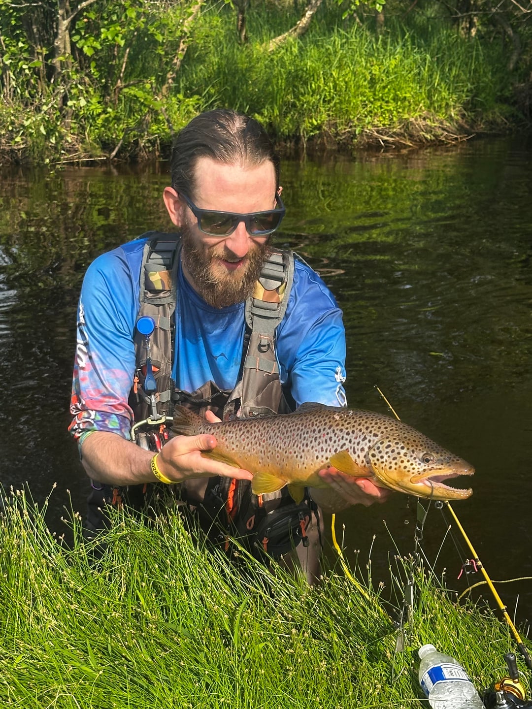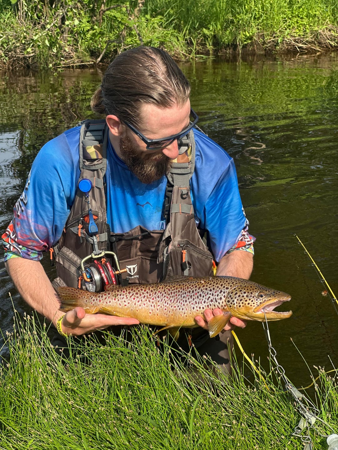 Best day on the river of my life. Landed a 23” male brown after casting a jerkbait about 10 times into the same hole underneath a fallen tree. The big boy took it so hard that I almost dropped my pole. After a 10 minute fight, he was on the stringer destined for my wall.