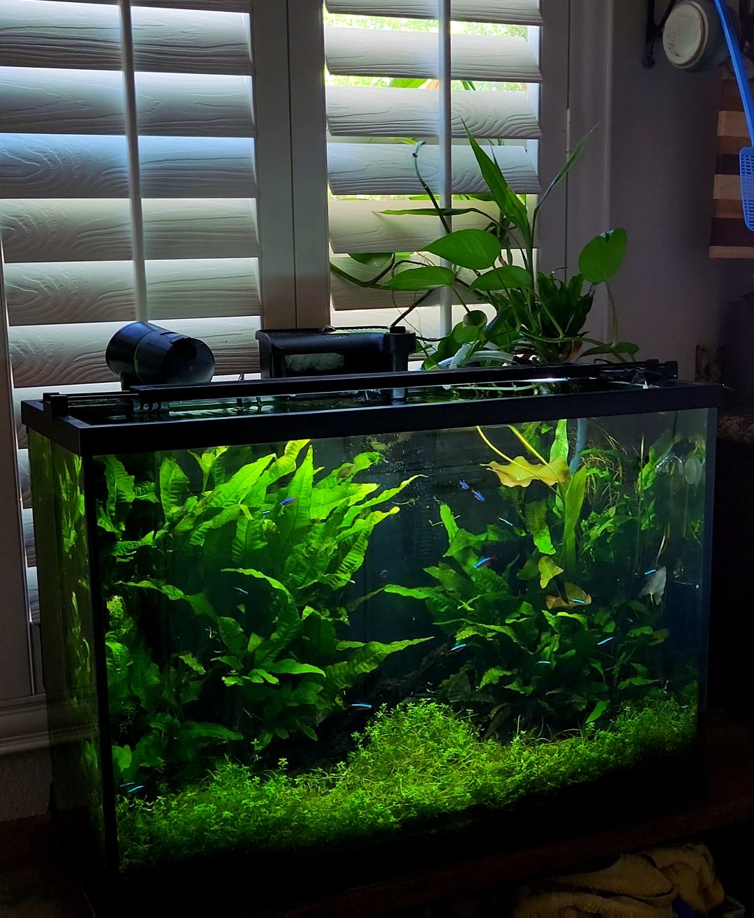 29 gal, ~22 or so Cardinal tetras, 3-4 amano, and 1 puppy that came with plants. I'm thinking possibly a gourami? I had 4 female betta in here (from a sorority) but they were getting too aggressive with the tetras. They were totally fine with eachother and the shrimp; I think they saw the tetras as possible food.