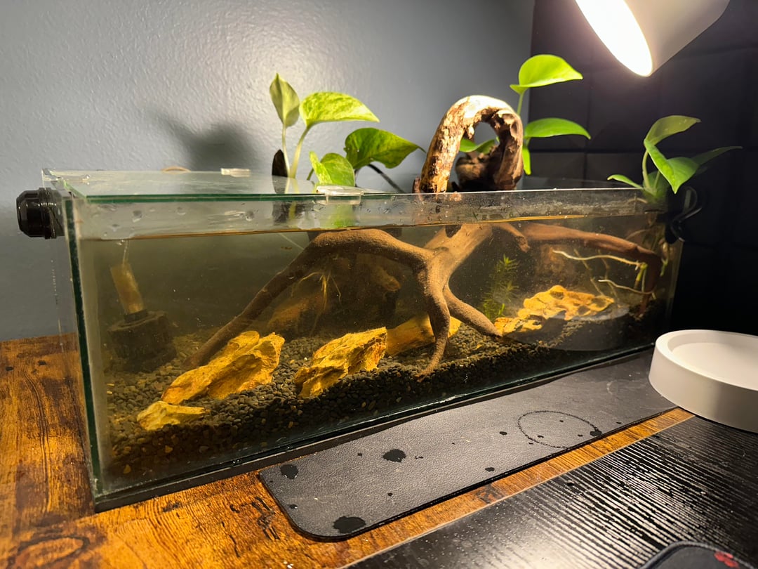 It’s about 7 gallons, I would love to hear some thoughts on the tank. Maybe how to change the aquascape or what to put in it like plants or fish. Preferably a smaller tropical fish.