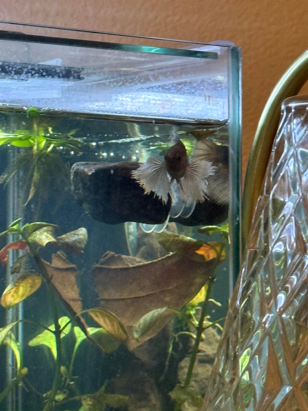 My betta’s floating plants all ended up pushed right over her lily pad that she loves to sleep on, and she just tucked herself right in 🥲 So cute!